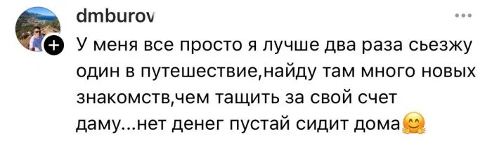 Поездки - это всегда классно. Но все ли готовы оплачивать путешествие на 100%? В соцсетях появилась тема о пополамщиках, но в новом контексте. Представьте, парень предлагает поехать куда-то вместе, но оплачивать нужно 50 на 50. Давайте посмотрим, что ответили девушки.