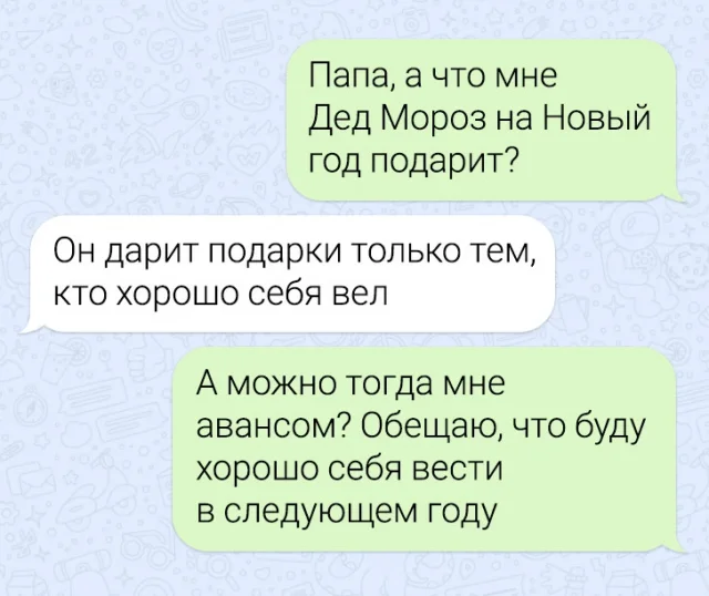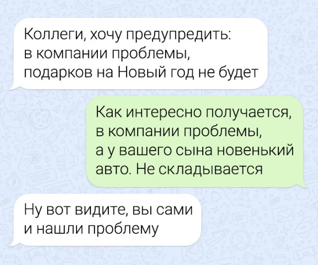 Предновогодние хлопоты захватывают многих. Корпоративы, подарки, поздравления – эти темы часто становятся предметом обсуждений не только в личных разговорах, но и в переписках. И не редко там случаются разные казусы и приколы. Давайте поглядим новую подборку забавных и предновогодних переписок.