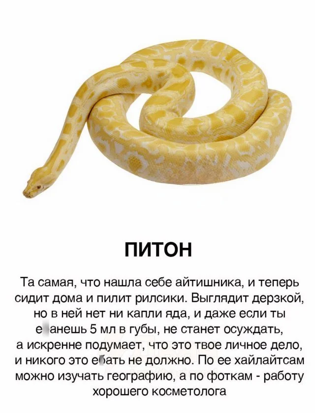 Вы видели уже немало таких забавных классификаций. Но обычно они касались парней. Теперь настала очередь девушек. Подружек сравнили со змеями и вот, что из этого получилось. Дамы, проверяйте, все ли верно истолковано.