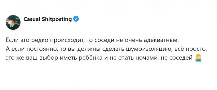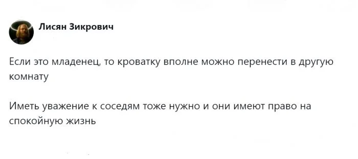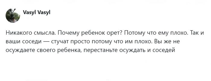 И это неудивительно: маленький человек становится для своих родителей, особенно для мамы, самым главным центром вселенной. Но если дом многоквартирный, то вместе с радостью прибавляется и ряд соседей. Которым младенческий плач, крики от колик, прорезывающихся зубов или просто сбившегося режима явно не по душе. Об этом они сообщают своими методами — например, стуком. Как же реагировать на подобные жалобы? Ведь до определённого возраста ребёнку просто невозможно что-либо объяснить или запретить — он этого не поймёт. Однако можно понять и соседей, которые, возможно, тоже сталкиваются с трудностями, не связанными с младенцем за стенкой. Люди делятся своими идеями о том, как справляться с такими конфликтами.