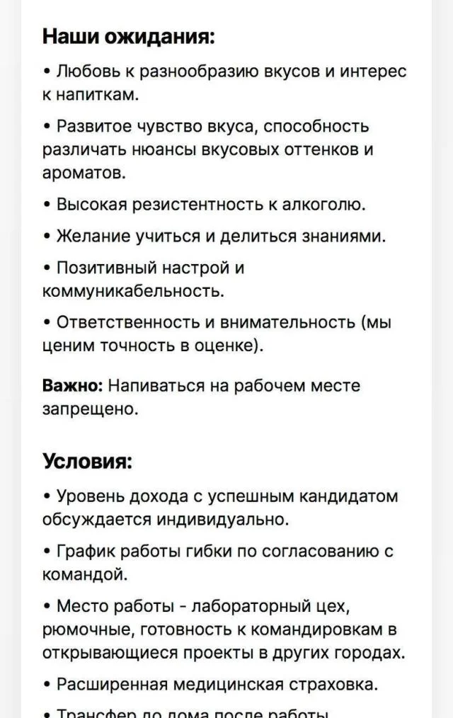 Вы ответственный и внимательный человек с душой поэта? Отлично. Для вас есть работенка. В Москве дегустатора настоек с зарплатой 305 тысяч рублей. Главная задача — тестировать вкус настоек и участвовать в создании новых. Ищут кандидата с крепким здоровьем и высокой устойчивостью к алкоголю. Работодатель предлагает гибкий график, медицинскую страховку, а также трансфер до дома в конце рабочего дня. Красота?