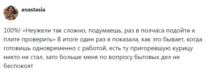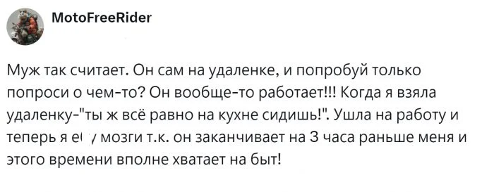 Но возникает проблема: зачастую домашние воспринимают удалёнщика в семье как нечто несерьёзное. Дескать, сидишь дома, ничего не делаешь. Поэтому должен 7 мешков фасоли перебрать, посадить 7 розовых кустов, прополоть грядки, вымыть окна, выбелить кухню, натереть полы, намолоть кофе на 7 недель, и в магазин сходить, и обед приготовить, и тётю Машу к стоматологу отвезти. Удалёнщики, понятное дело, таким подходом искренне недовольны и отказываются, ведь работа сама себя не сделает, как доказывают мнения негодующих пользователей.