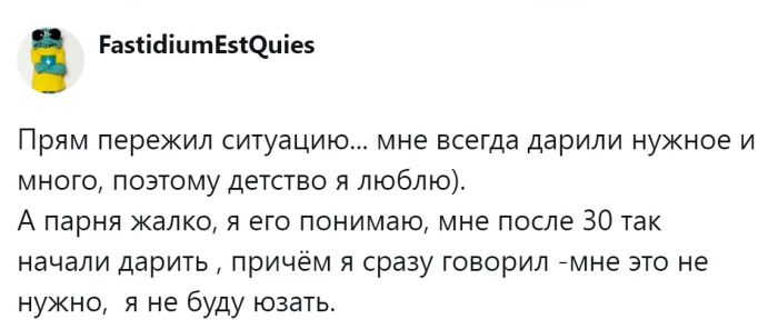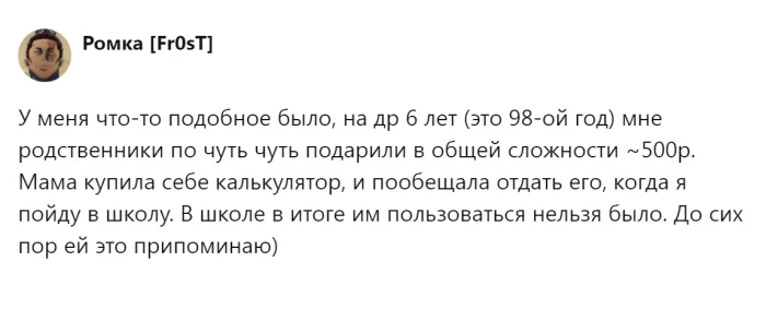 Детство — это период, наполненный радостными моментами, но иногда оно оставляет и горькие воспоминания. Кто из нас не мечтал о заветной игрушке, любимой книге или новом гаджете? Однако вместо ожидаемого подарка мы нередко сталкивались с разочарованием: родители обещали одно, а в итоге приносили совершенно другое… Или же просто забирали деньги себе, оправдываясь нехваткой средств или более важными нуждами.