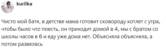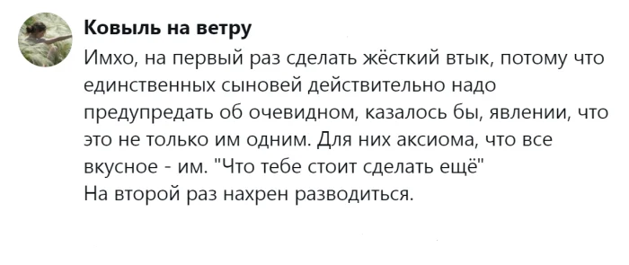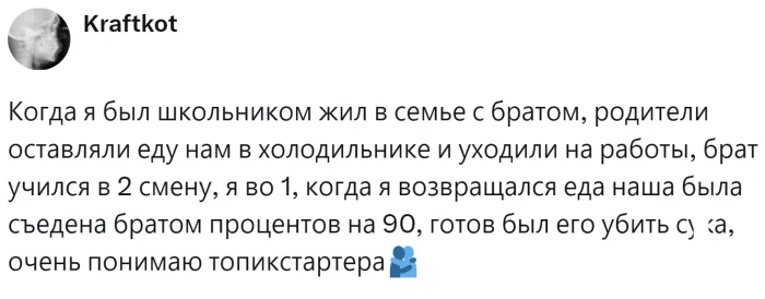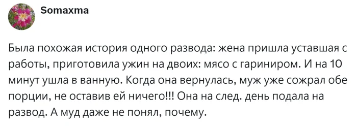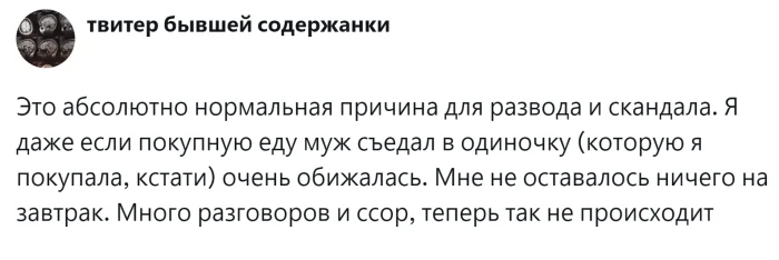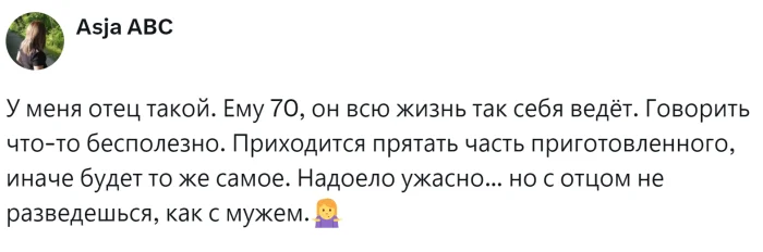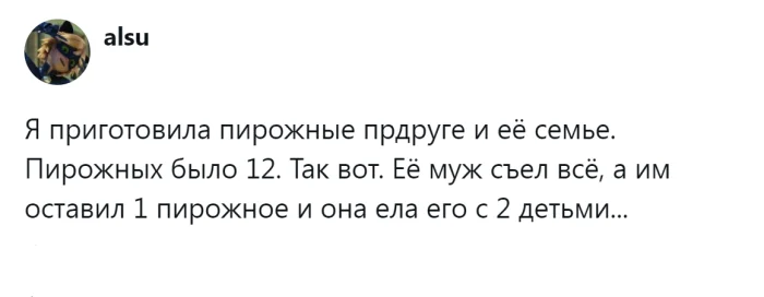 Однако у некоторых взрослых, особенно мужчин, информация буквально проходит мимо ушей. Иногда родители чрезмерно балуют своих детей, отдавая им всё самое лучшее, при этом сами лишают себя многого. В результате, когда такие дети вырастают и начинают семейную жизнь, у них возникают серьёзные проблемы. Например, последний йогурт или творожок, предназначенный для ребёнка, оказывается съеденным, или пицца, которую никто из домочадцев не успел попробовать, исчезает в одно мгновение. Пользователи поделились своими печальными историями, которые порой приводят даже к разводам, и пришли к неутешительным, хотя иногда и обнадёживающим выводам.