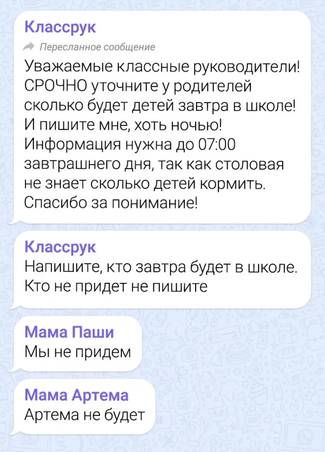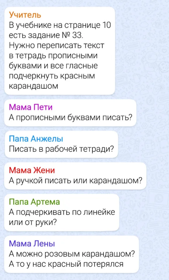 Поиск листьев в зимний период, сбор средств на школьные нужды, помощь детям с выполнением домашних заданий — эти ситуации знакомы каждому родителю, чей ребенок учится в школе. Раньше такие вопросы решались исключительно в кругу семьи. Однако с появлением родительских чатов процесс, казалось бы, стал более удобным. Но, как выяснилось, вместе с новыми возможностями возникли и дополнительные сложности.