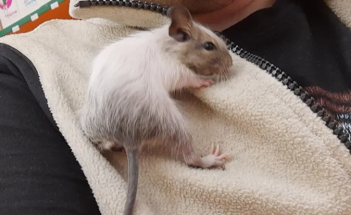 Офигевшая и замерзшая, но крайне адекватная. Сразу залезла ко мне под воротник свитера и заснула. Я пообещала, что мы обязательно ее пристроим, и мужчина ушел. Крыса оказалась на редкость ручной, очень умной и контактной. Большую часть дня она провела со мной, а вечером присоединилась к моей веселой компании — котам, собаке и улитке. Сейчас Киса живет в большой клетке, спит у меня в капюшоне, я купаю ее в раковине специальным шампунем. Она держит в страхе котов, а собака все время пытается ее облизать. Всю жизнь мечтала о крысе, но у меня на них контактная аллергия.