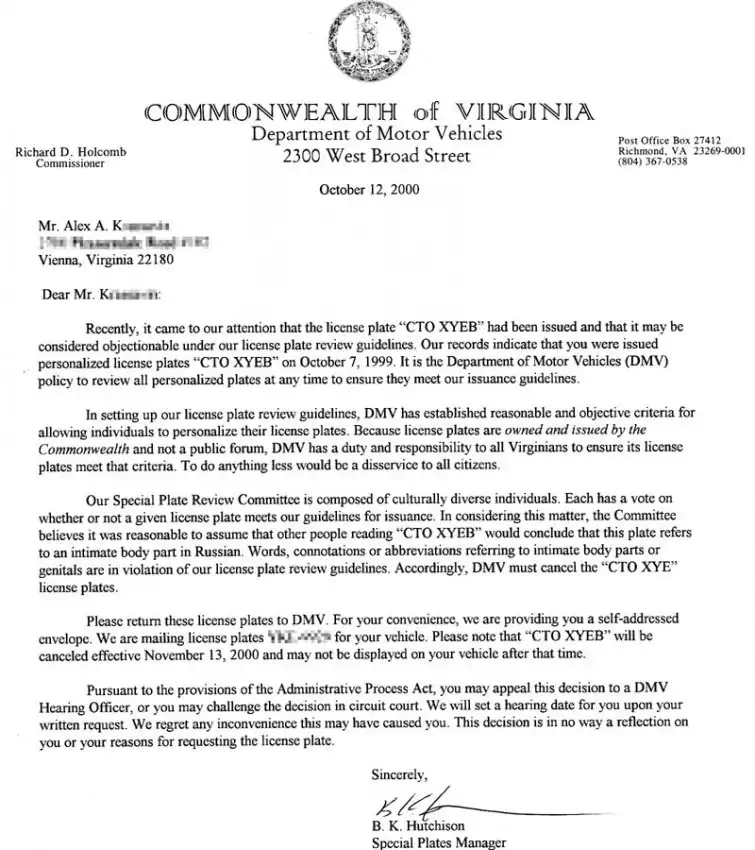 Краткий смысл письма: департамент транспортных средств штата Вирджиния просит в письме нового владельца специально заказанных номеров прислать их обратно, так как департамент узнал, что слова на номере обозначают "интимную часть тела" на русском языке. :)