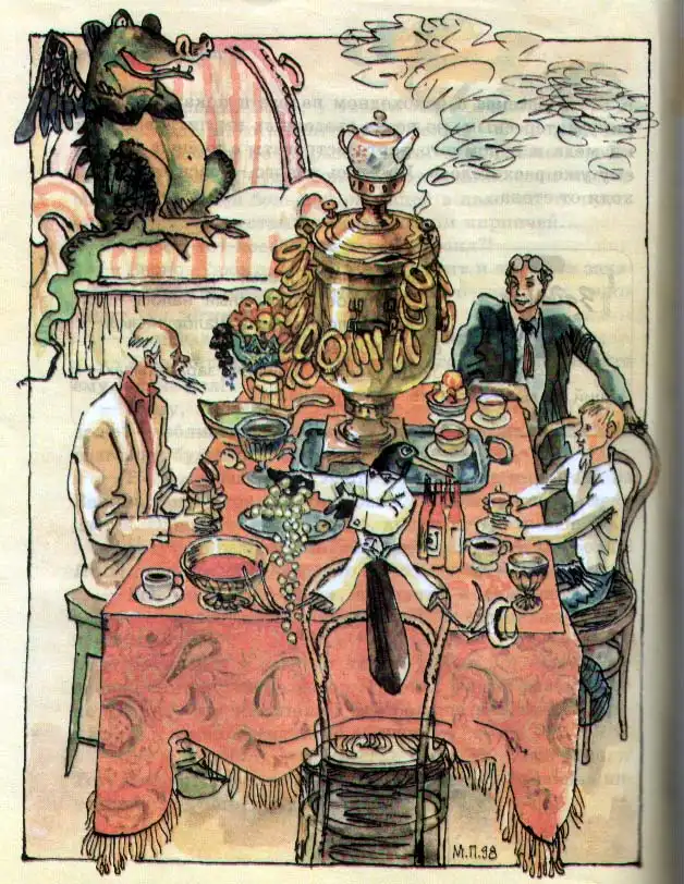 Не знаю можно ли сделать из самовара бурбулятор, но им это удалось. На кресле - все тот же окрыленный крокодил. Дедуля судя по кружке заправляется пивом. Птица отрастила себе хвост как у бобра. И лапы, как у .... неизвестны мне такие твари. А мужчина в костюме - из налоговой. Я когда в рознице работал мы тоже их пирами встречали, угощали по всякому, по кабакам водили, взятки давали... Накуривать их, как-то в голову не приходило.