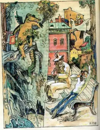 Грибы не нарисованны, но крокодил на дереве опять появился. На скамеечке откровенно иностранный шпион вербует мальчика, купив его сотовым телефоном.