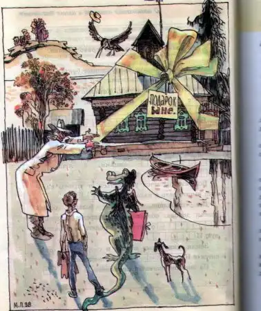 А мальчик-то с запросами оказался... Пытался его шпион сотовым телефоном купить, а Ваня себе дом выторговал. Вот так мы всегда и выигрываем на одном кураже, да на халяву. Правда художника опять понесло - и крокодил с крыльями и лодка в луже и поза у шпиона странновата.