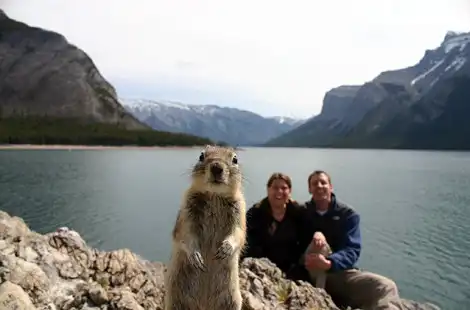 Белке из Канады удалось попасть на фото семейной пары, а затем – на страницы журнала National Geografic. Во время съемки камера стояла на штативе со включенным таймером, чтобы запечатлеть супругов Брандтс на фоне озера Минневанка. Однако кадр вышел гораздо более интересным – перед объективом выскочила случайно оказавшаяся рядом белка. Читатели National Geografic были настолько потрясены выразительностью фото, что поначалу не поверили, что это действительно живой кадр, которого не коснулась рука редактора.