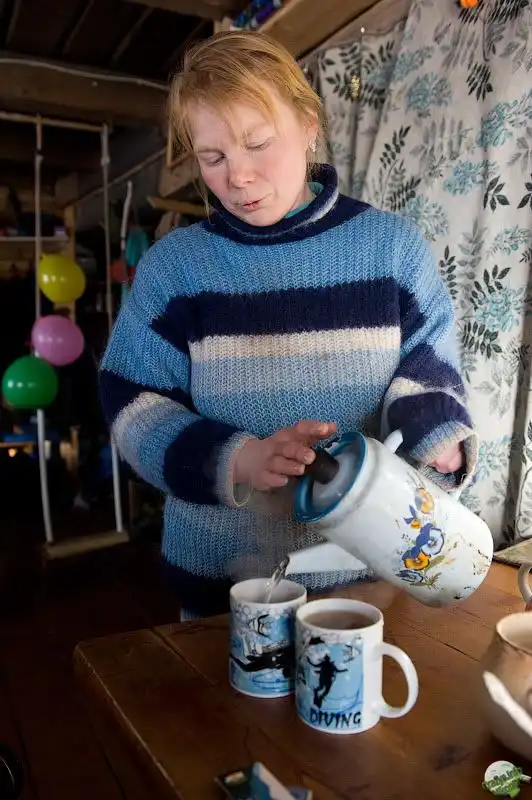 11. Начинаются разговоры - про деревенскую жизнь, про дельфинов и работу, про походы и приключения. Вокруг неугомонным волчком бегает трехлетняя Вика: подбежит, оседлает невидимого коня и тут же со смехом снова примется бегать по комнате. Вика и её мама Полина живут у Маши с Мишей. Не потому, что родственники, а просто так. Для пресыщенной столицы просто взять и приютить человека, попавшего в сложную жизненную ситуацию - непозволительная роскошь. Но здесь, в приполярье, жизнь идёт по другим, действительно человеческим законам. Ближе к вечеру приходит Миша. Сейчас он отвечает за встречу всех туристов в дайв-клубе. Туристы приезжают и днем, и ночью, и упрятанная в глубине тулупа в дальнем углу рация то и дело оживает и рассказывает Мише о будущих гостях. "Миша? Он тоже не отсюда. Его сюда тоже завели путешествия. Вообще-то он из Питера, закончил там ветеринарный". Тут, в приполярье, они и встретились.