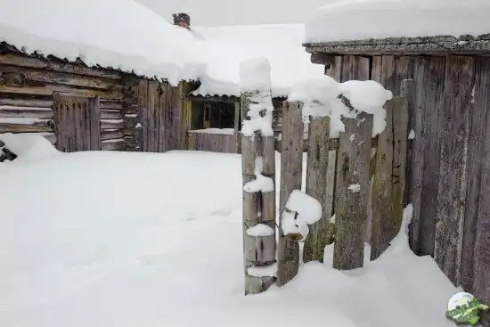7. В деревне пару лет назад открыли магазин, только вот посмотреть, что же там продают, нам так и не довелось: хозяйка лавки уехала пополнять запасы, и до нашего отъезда не вернулась. Недалеко от магазина стоит вышка со здоровенной спутниковой тарелкой на вершине. Внизу к бревнам вышки прикручена ярко-синяя телефонная будка, резко контрастирующая с белым безмолвием.