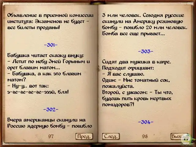Просыпается старик Хоттабыч ,(промозглое осеннее утро,похмелье...) открывает один глаз и обводит взглядом комнату: кругом валяются пустые бутылки,мебель поломана...открывает второй глаз: вместе с этим движением в голову приходит острая боль; он стонет и тянется к бороде... Не обнаружив там ни одного волоска - хватается за голову... лысо, смотрит на грудь, в подмышках - нет волос. Оттягивает резинку трусов и заглядывает ... НУ СЛАВА БОГУ - ХОТЬ НА ПИВО ОСТАЛОСЬ!!!
