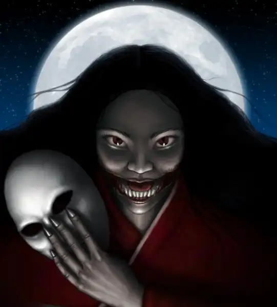 Эта страшилка стала такой популярной, потому-что полиция находила похожие записи в архивах дел, сообщениях газет и телевидения. Если верить легенде, то по улицам страны бродит невероятная красавица с повязкой на лице. Встретив ребенка, она задает вопрос о том, красива ли она. Если ребенок сразу не ответит, она снимает повязку, обнажив щель вместо рта, страшные острые зубы и змеиный язык. После этого она спросит: «А теперь?». Если ребенок ответит отрицательно, она отрежет ему голову. А если положительно — сделает такой же рот ему. Говорят, чтобы спастись, нужно спросить ее первой о чем-то или дать уклончивый ответ.
