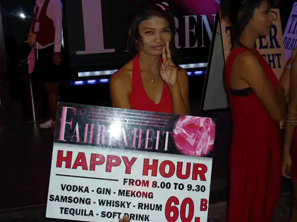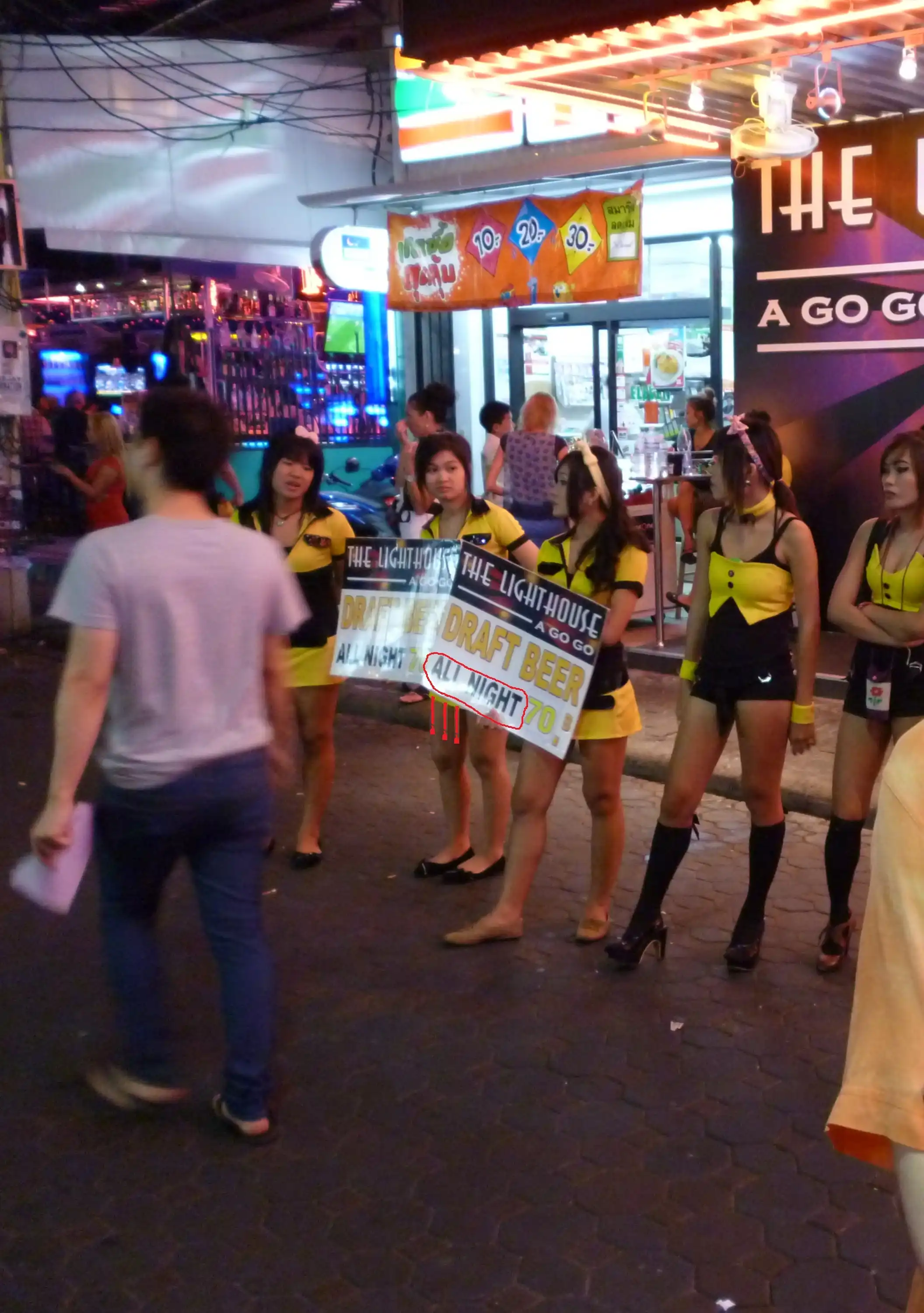 Почему именно на одной улице столько разврата: правительство решило, что бороться с этим бесполезно и слишком затратно, поэтому лучше это контролировать в одном месте и приняло постановление об официальном разрешении проституции, всего этого разврата, но только на этой улице!!! Цены девушек по вызову варьируются от 45 до 70 рублей на этой улице (ИМЕННО РУБЛЕЙ, 1 рубль=1 местному Батту, на некоторых табличках написано, что за ночь!!!) (я там просто гулял=))))), но для любителей халявы таких развлечений у заказанной девочки в самый ответственный момент может оказаться сюрпрайз в виде девайса из здоровенного мужского "болта" - это уже как повезет, может и оказаться нормальная гирла))) - об этом “возможном сюрпрайзе на волкен стрите” предупреждают все гиды туристов.