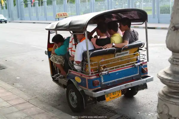 (фото – при перегрузе в тук-туке люди стоят на подножке и держатся за верхний каркас.)