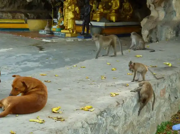 По буддизму существует вера в реинкарнацию (перерождение) и человек, который совершил ужасные поступки в прошлой жизни (к примеру, убийство), рождается!!! СОБАКОЙ и теперь эти "убийцы в прошлом" искупают свою вину на земле в шкуре собаки!!! И отношение ко всем собакам соответствующее. Отношение толерантное, они их не бьют, но и не кормят, не обращают на них внимания и смотрят с презрением. Если турист гладит собаку - для тайца это дикость! Очень интересно, что такая культура и формирует поведения самих собак: все собаки не гавкают вообще, ходят с опущенными головами и максимум, что могут сделать, с опущенной головой уткнуться носом в ногу...