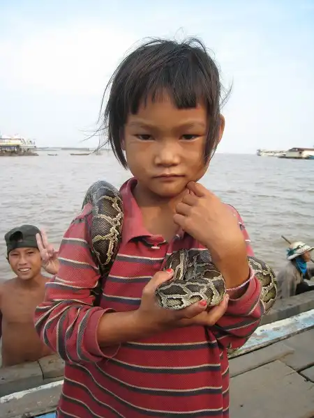 В Камбоджии был на озере, где люди живут на воде, дети плавают в алюминевых тазиках со змеями.
