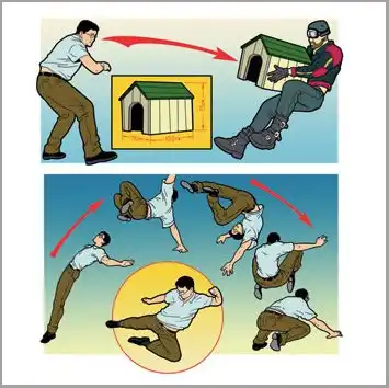 Если недоброжелатели каким-то образом узнали, что конура пуста, прибегни к следующим действиям. Перво-наперво с криком «Лови!» брось конуру по направлению к самому сильному из противников (рис. 1). Пока он будет находиться в легком замешательстве, подскочи к самому слабому из нападающих и проведи быструю серию ударов ногами (йокогири-маваша-урамаваша) по туловищу и голове. Затем соверши двойное сальто назад (рис. 2) и огляди поле боя. Дальнейшие действия напрашиваются сами собой: просто поступай по обстановке.