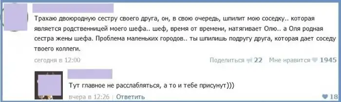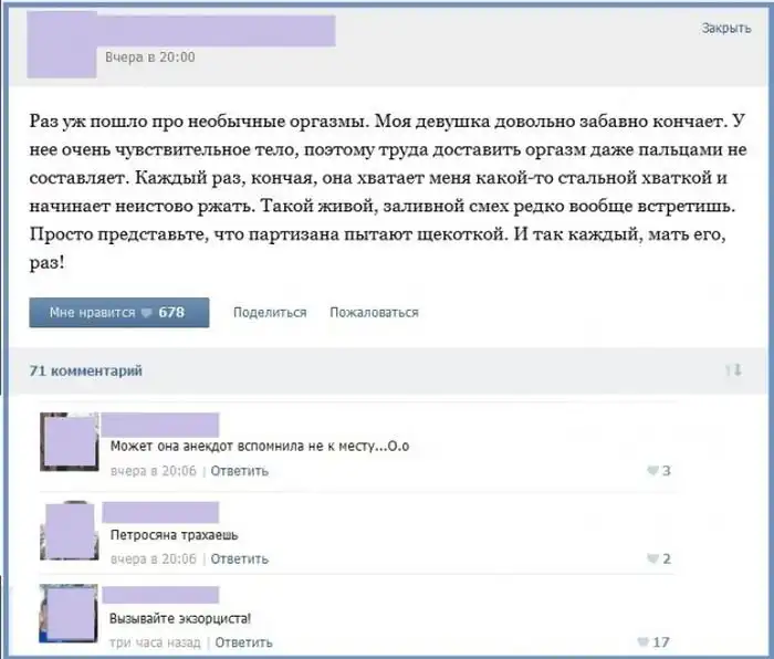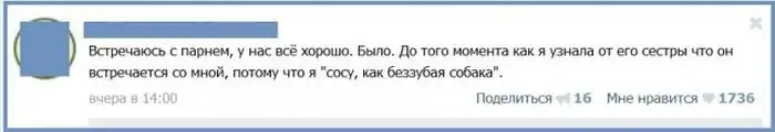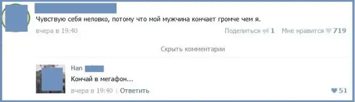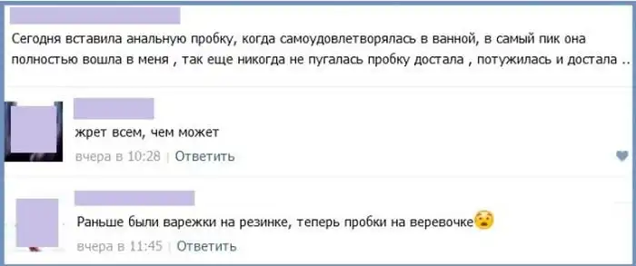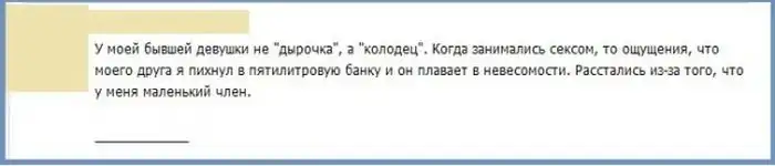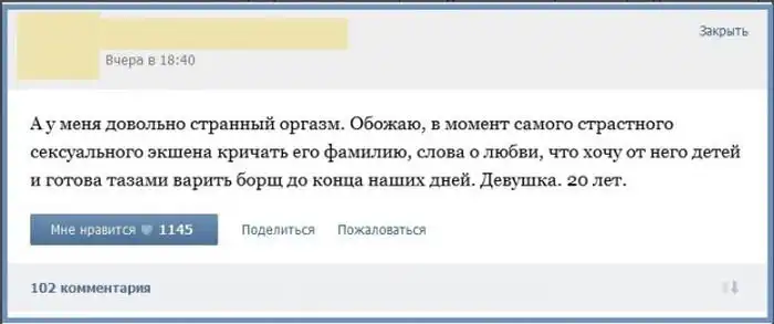 Пользователи сети давно уже стали обсуждать подробности своей интимной жизни в интернете, и порой здесь появляются весьма забавные истории с не менее смешными комментариями к ним.