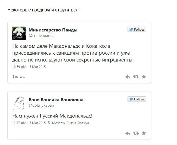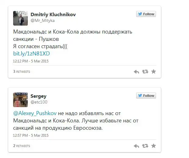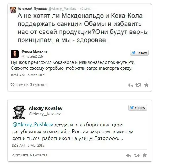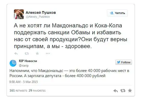 На фоне продления санкций стран Запада в отношении России Алексей Пушков, председатель Международного комитета Госдумы, предложил избавить граждан нашей страны от продукции компаний McDonald's и Coca-Cola. Свое предложение Пушков обнародовал в социальной сети twitter утром 5-го марта. Реакция пользователей последовала незамедлительно.