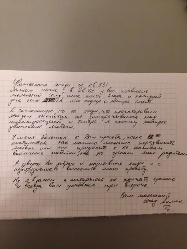 Мои друзья недавно переехали в новую квартиру. Соседи сверху по вечерам что то двигали, роняли, вообщем ребенок моих друзей часто просыпался от шума сверху. Мой друг, отец ребенка, хотел пойти ругаться с ними, но его жена остановила и сказала что сама разберется. Вот что из этого вышло..