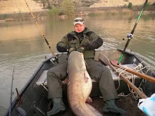 Итак, Курт узрел камеру, подплывает к ней и цапает веревку. Сом ( как оказалось он был очень сердит )недовольный тем, что его потревожили, немедленно несется прочь, попутно выдергивая из лодки Курта как пробку из бутылки. Тот еще в полете соображает, что рыбка шутить не намерена, а посему пора делать ноги. К нашему берегу (ширина Волги в этом месте метров 150)он подплыл ( или подбежал, пес его знает, во всяком случае во время заплыва он не погружался в воду больше чем по пояс)минут через 5, а это я думаю тянет на мировой рекорд. Далее было делом техники. Дед метнулся к соседу, схватил весла, прыгнул в его лодку и на всех парах помелся к выныривающей из волн камере. Из воды он ее доставать не стал, просто привязал к ней веревку, а веревку зацепил за нос лодки. Мы стояли на берегу и наблюдали как сом катает деда по реке. Курт забыл про свою мокрую одежду, с глазами как у совы смотрел то на меня, то на деда в лодке и беспрестанно вопрошал;Was ist das? , иногда вставляя; Ни х#я сепе! Потаскав деда с полчаса, сом утомился и дед стал потихоньку править к берегу. Подошел сосед, заинтригованный неожиданной прытью деда, уволокнувшего весла и лодку.