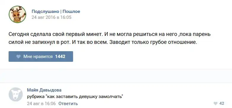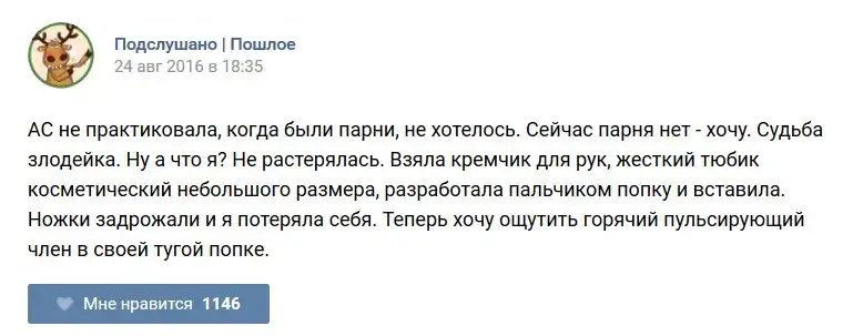 У каждого человека есть своя любимая группа или любимое сообщество в какой-либо социальной сети. Иногда это группа не совсем приличная, поэтому нет возможности в открытом режиме подписаться на неё и прочитывать свежие посты. Мы предлагаем вам очередную порцию из серии интересных постов в группе «Подслушано пошлое». Сегодняшняя запись: Подслушано пошлое (25 фото) предлагает посмотреть несколько интересных и запоминающихся постов, вместе с комментариями из данной группы в социальной сети ВКонтакте.