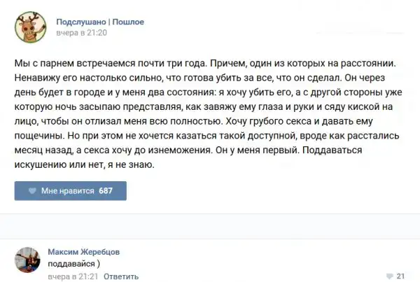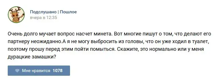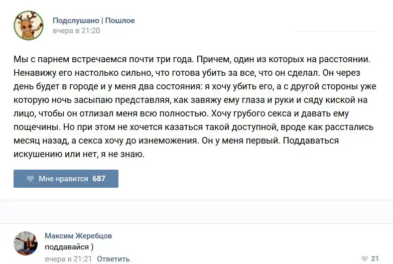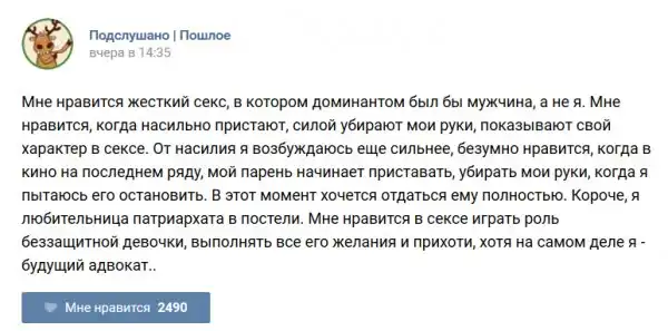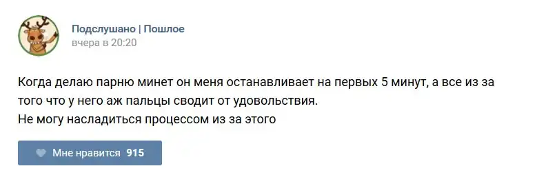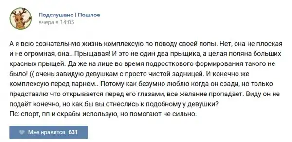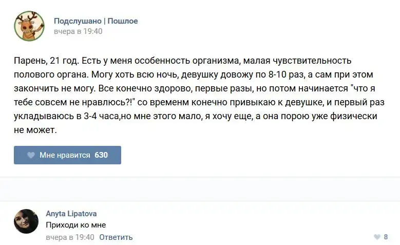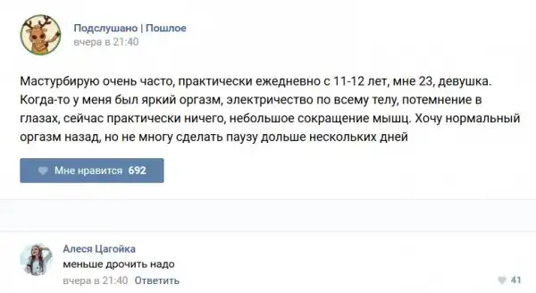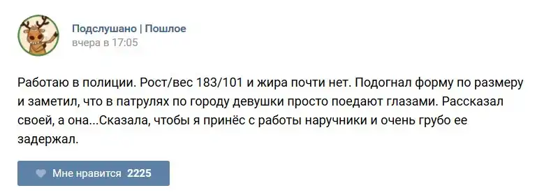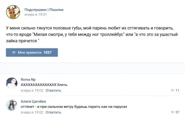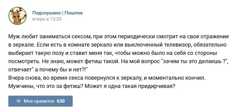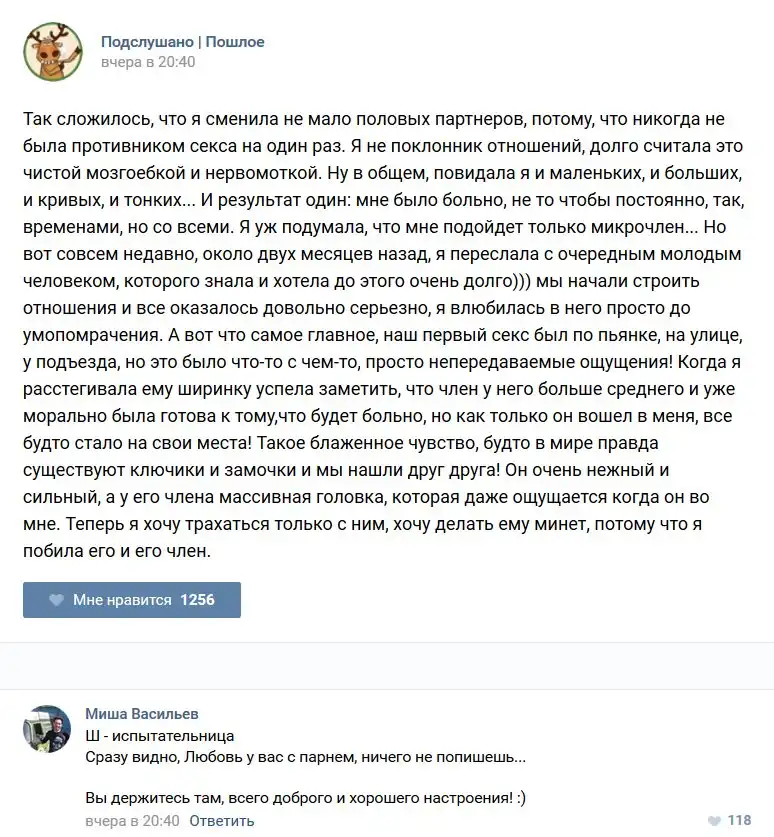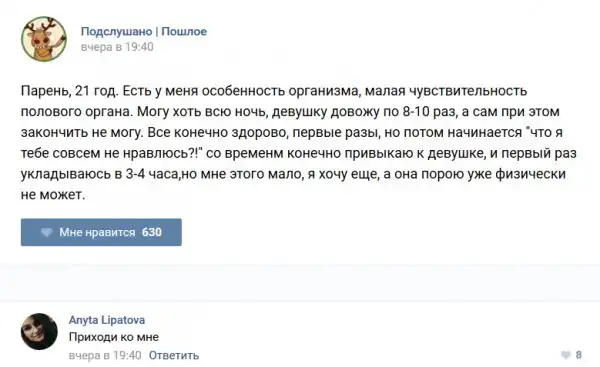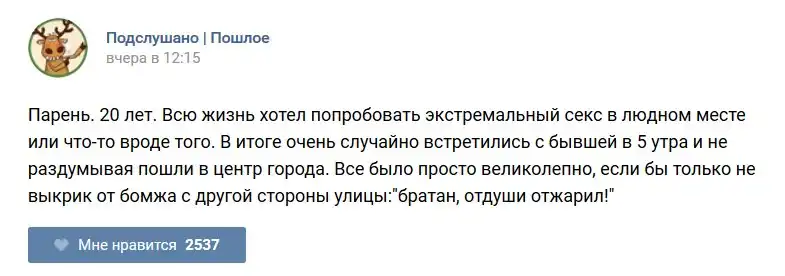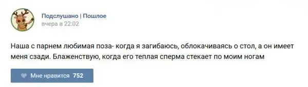 У каждого человека есть своя любимая группа или любимое сообщество в какой-либо социальной сети. Иногда это группа не совсем приличная, поэтому нет возможности в открытом режиме подписаться на неё и прочитывать свежие посты. Мы предлагаем вам очередную порцию из серии интересных постов в группе «Подслушано пошлое». Сегодняшняя запись: Подслушано пошлое (25 фото) предлагает посмотреть несколько интересных и запоминающихся постов, вместе с комментариями из данной группы в социальной сети ВКонтакте.