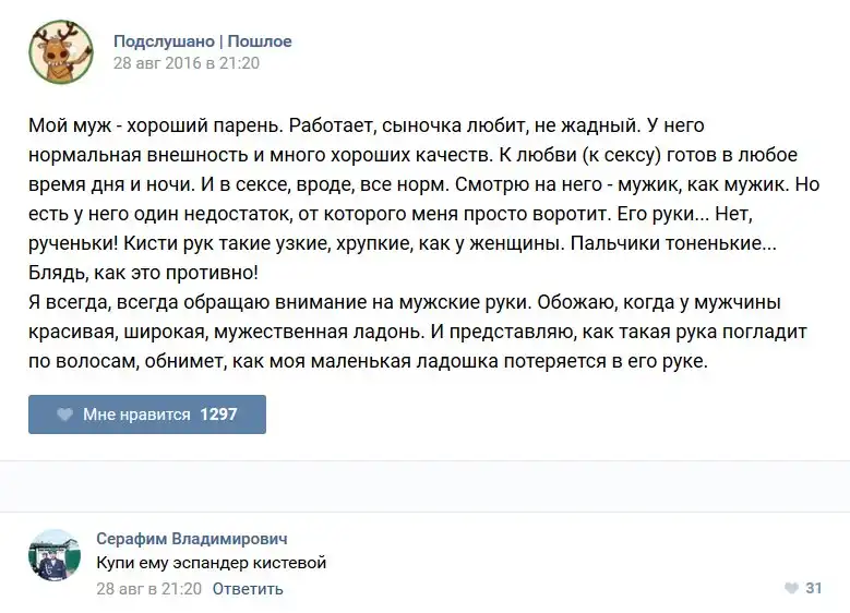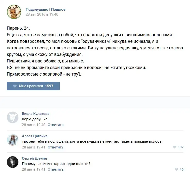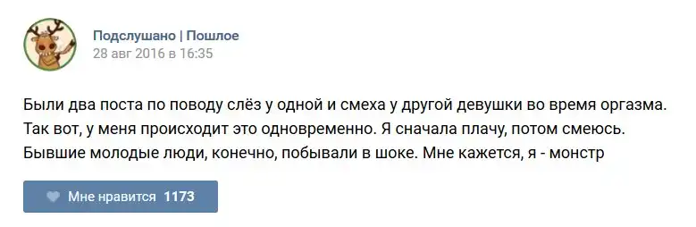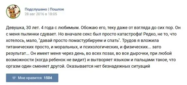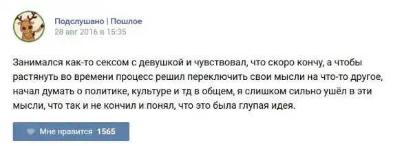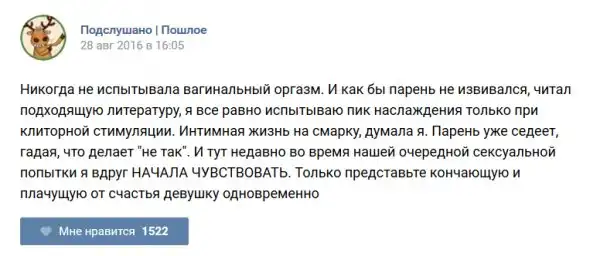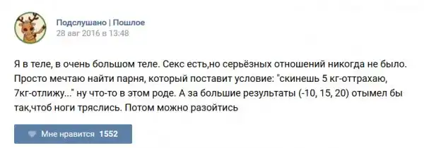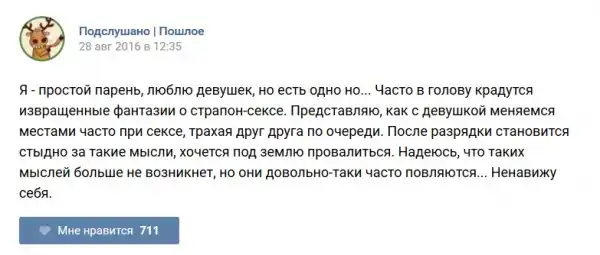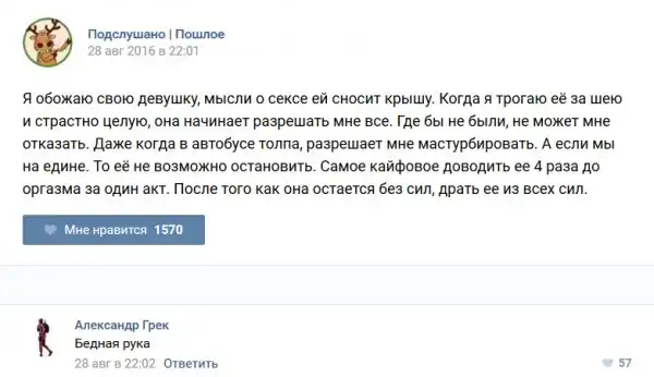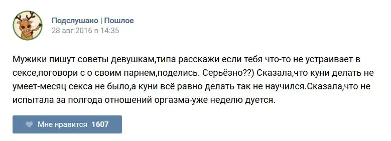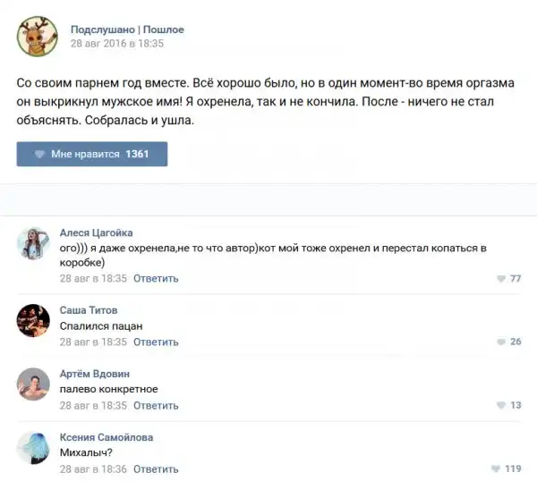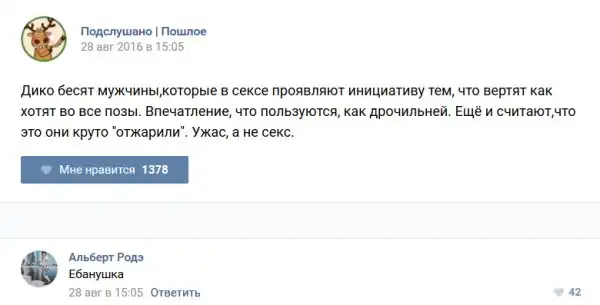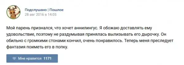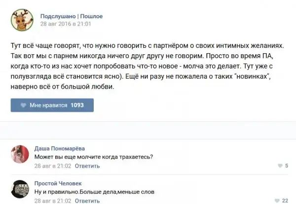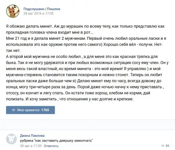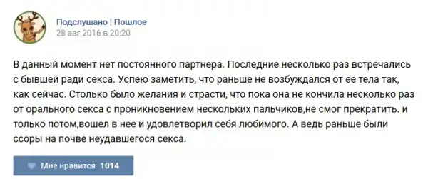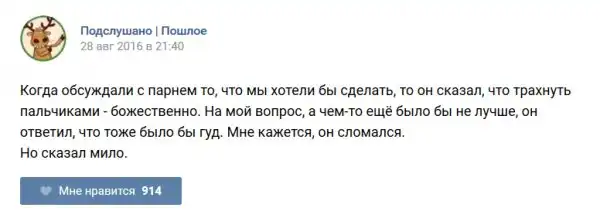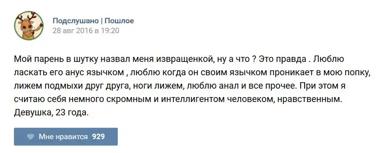 У каждого человека есть своя любимая группа или любимое сообщество в какой-либо социальной сети. Иногда это группа не совсем приличная, поэтому нет возможности в открытом режиме подписаться на неё и прочитывать свежие посты. Мы предлагаем вам очередную порцию из серии интересных постов в группе «Подслушано пошлое». Сегодняшняя запись: Подслушано пошлое предлагает посмотреть несколько интересных и запоминающихся постов, вместе с комментариями из данной группы в социальной сети ВКонтакте.