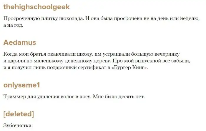 Многим знакомы случаи, когда подаренные нам подарки нас разочаровывают. Вспоминая свои не самые лучшие подарки, не стоит огорчаться, ведь есть люди, которым в этом плане совсем не повезло.