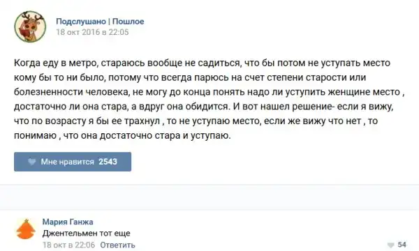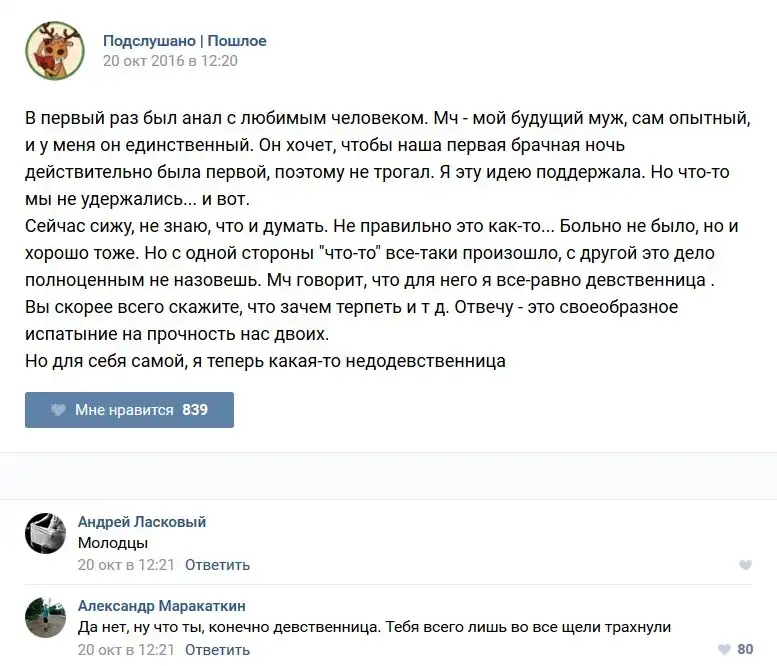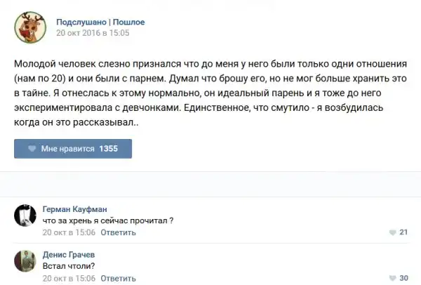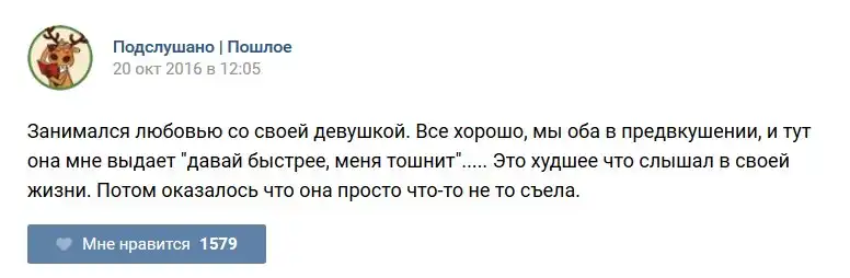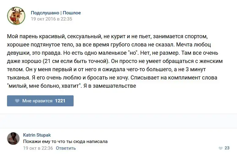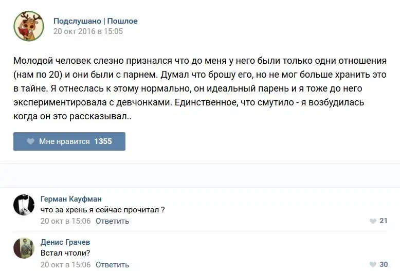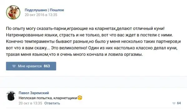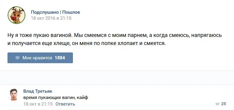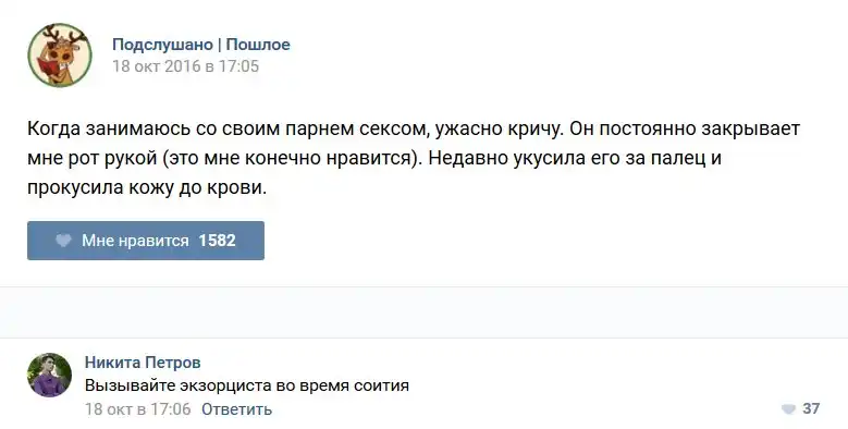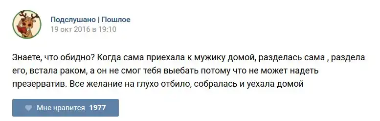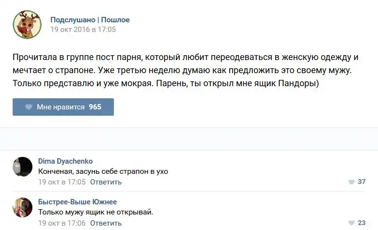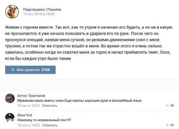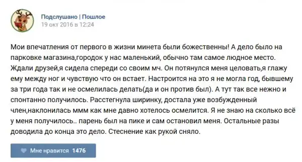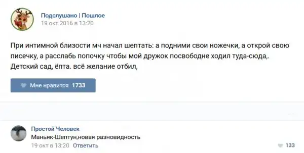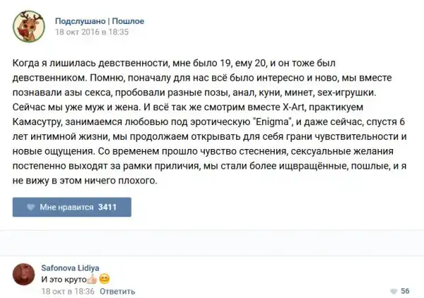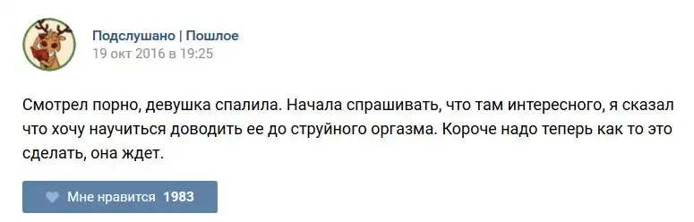 У каждого человека есть своя любимая группа или любимое сообщество в какой-либо социальной сети. Иногда это группа не совсем приличная, поэтому нет возможности в открытом режиме подписаться на неё и прочитывать свежие посты. Мы предлагаем вам очередную порцию из серии интересных постов в группе «Подслушано пошлое». Сегодняшняя запись: Подслушано пошлое предлагает посмотреть несколько интересных и запоминающихся постов, вместе с комментариями из данной группы в социальной сети ВКонтакте.