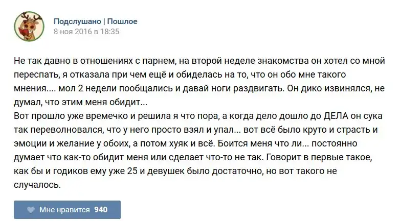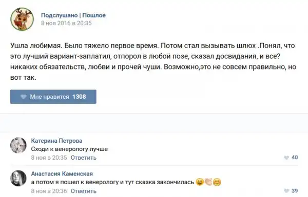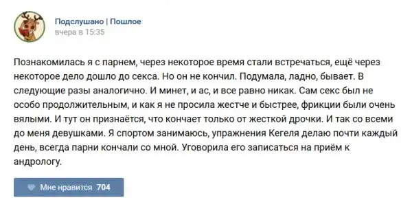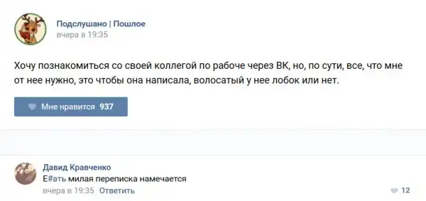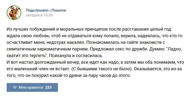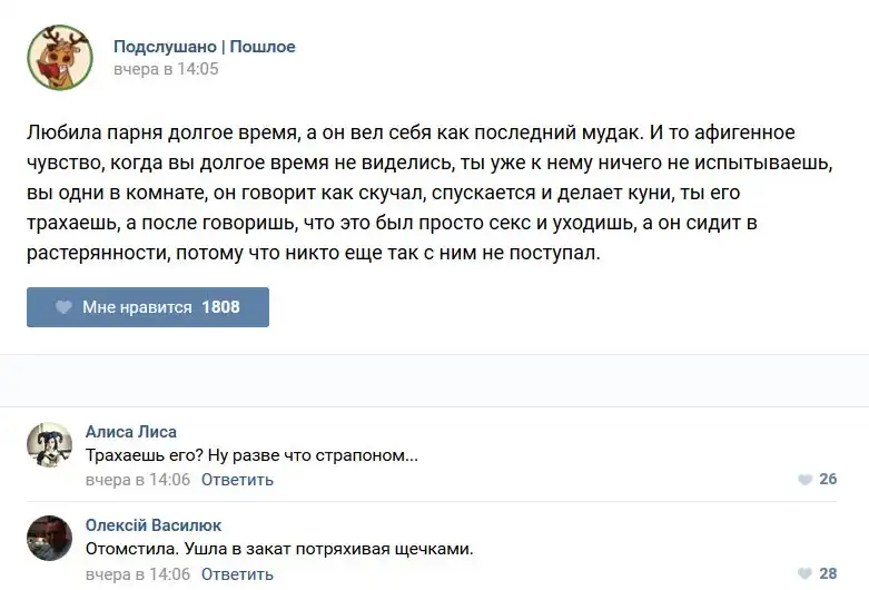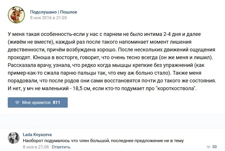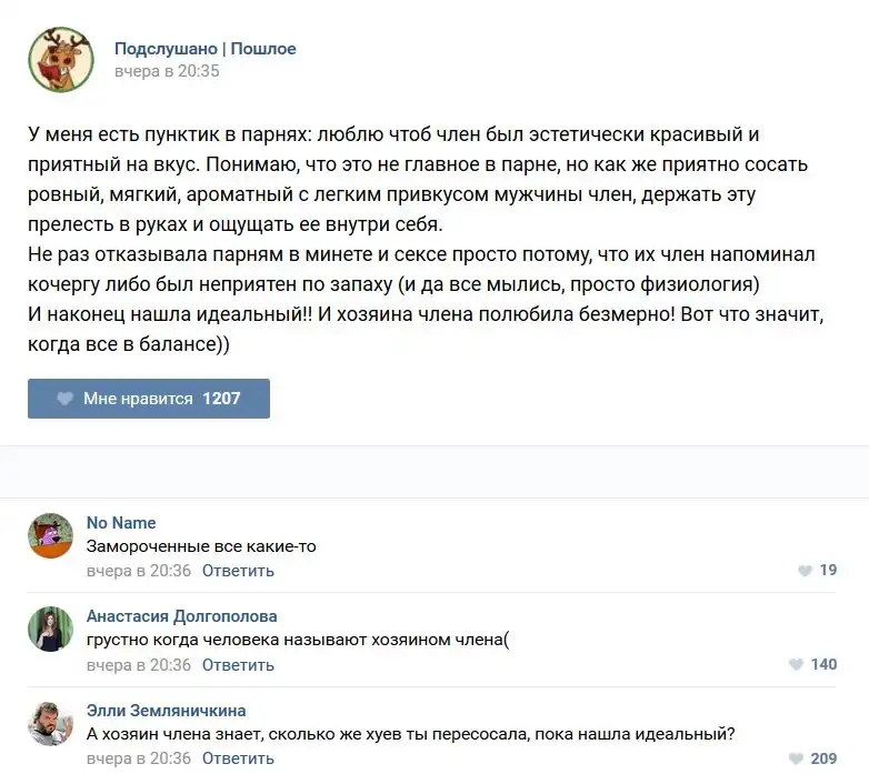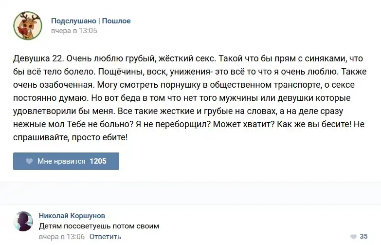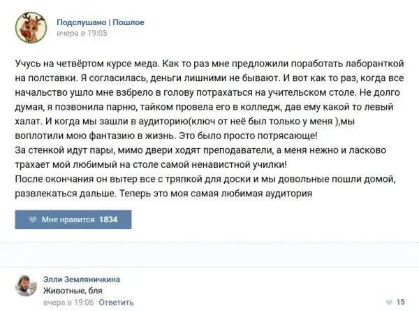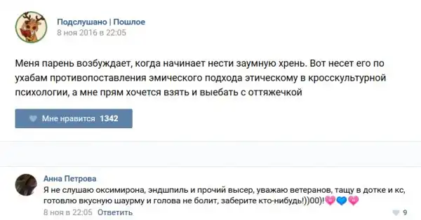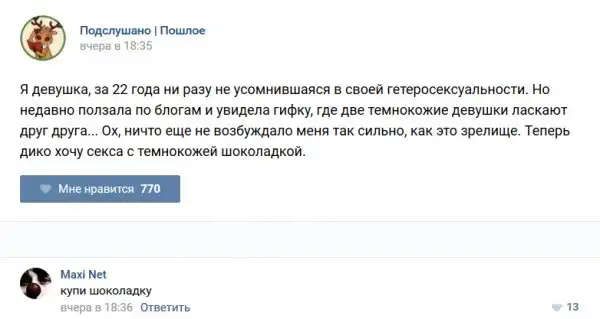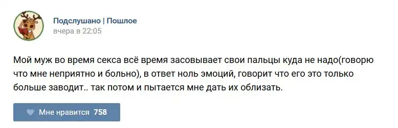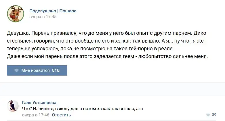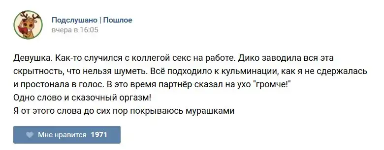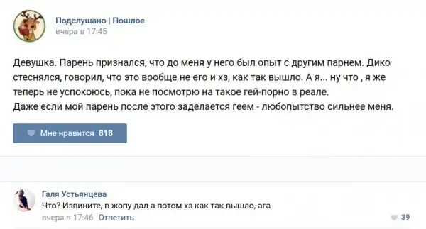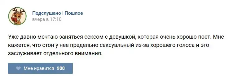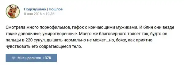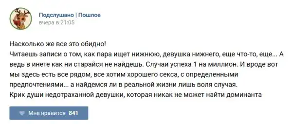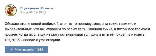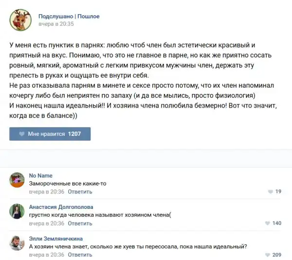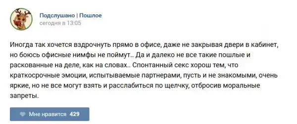 У каждого человека есть своя любимая группа или любимое сообщество в какой-либо социальной сети. Иногда это группа не совсем приличная, поэтому нет возможности в открытом режиме подписаться на неё и прочитывать свежие посты. Мы предлагаем вам очередную порцию из серии интересных постов в группе «Подслушано пошлое». Сегодняшняя запись: Подслушано пошлое предлагает посмотреть несколько интересных и запоминающихся постов, вместе с комментариями из данной группы в социальной сети ВКонтакте.