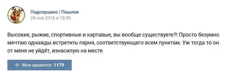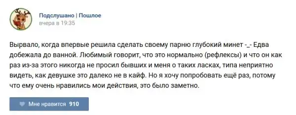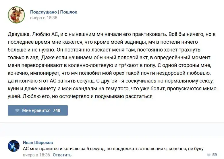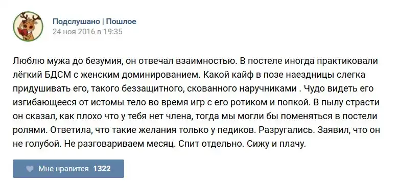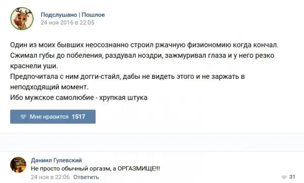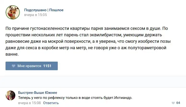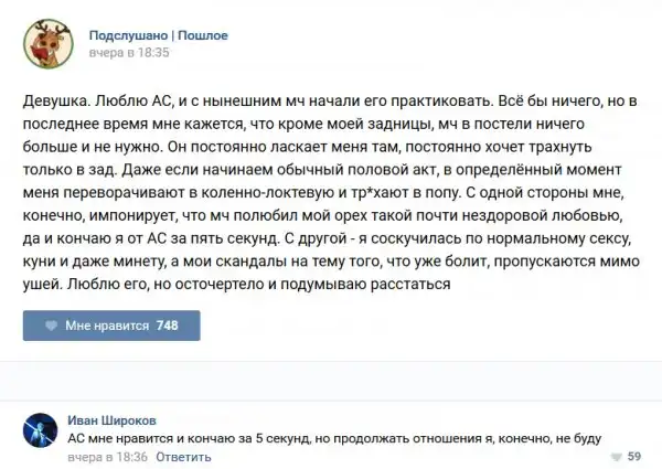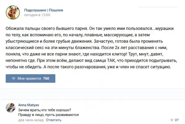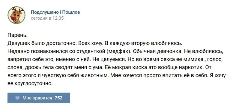 У каждого человека есть своя любимая группа или любимое сообщество в какой-либо социальной сети. Иногда это группа не совсем приличная, поэтому нет возможности в открытом режиме подписаться на неё и прочитывать свежие посты. Мы предлагаем вам очередную порцию из серии интересных постов в группе «Подслушано пошлое». Сегодняшняя запись: Подслушано пошлое предлагает посмотреть несколько интересных и запоминающихся постов, вместе с комментариями из данной группы в социальной сети ВКонтакте.