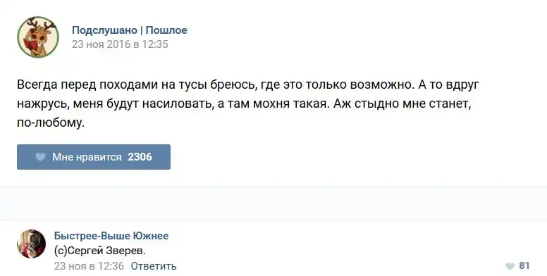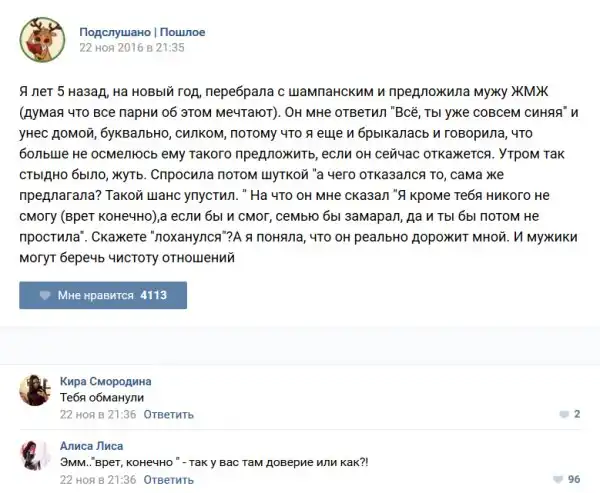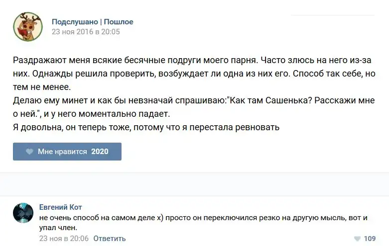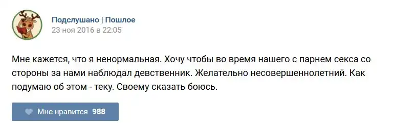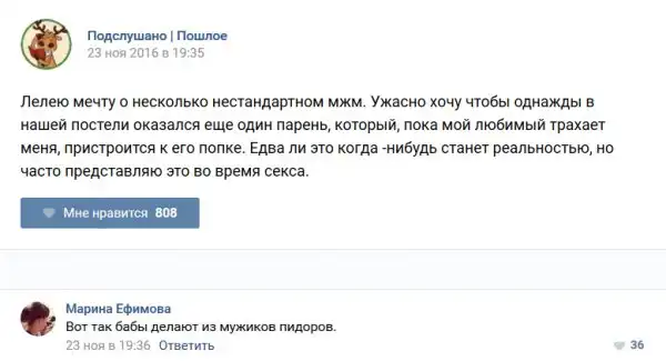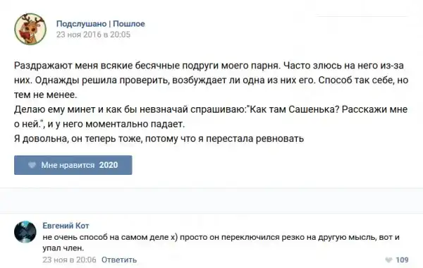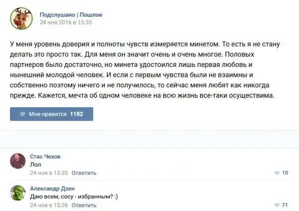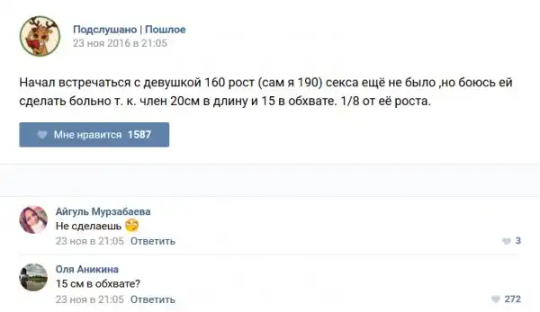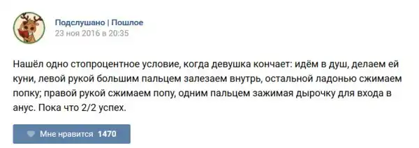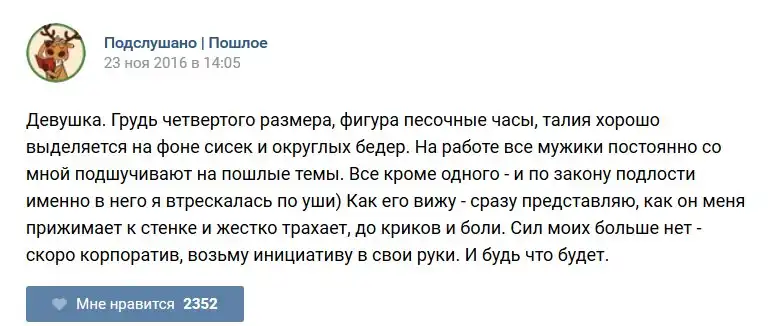 У каждого человека есть своя любимая группа или любимое сообщество в какой-либо социальной сети. Иногда это группа не совсем приличная, поэтому нет возможности в открытом режиме подписаться на неё и прочитывать свежие посты. Мы предлагаем вам очередную порцию из серии интересных постов в группе «Подслушано пошлое». Сегодняшняя запись: Подслушано пошлое предлагает посмотреть несколько интересных и запоминающихся постов, вместе с комментариями из данной группы в социальной сети ВКонтакте.