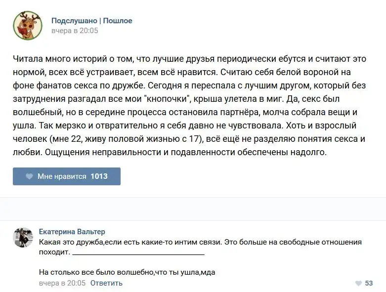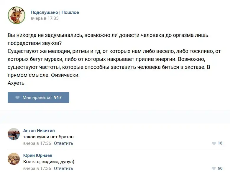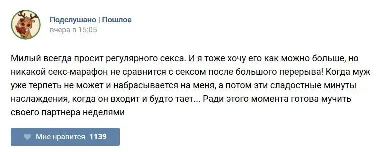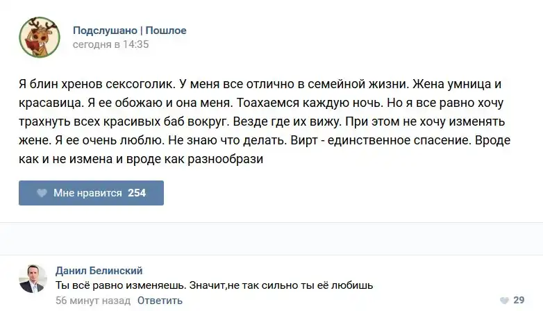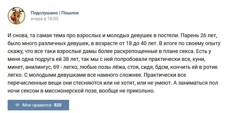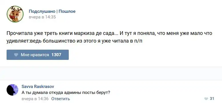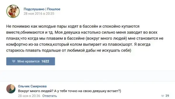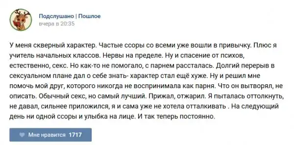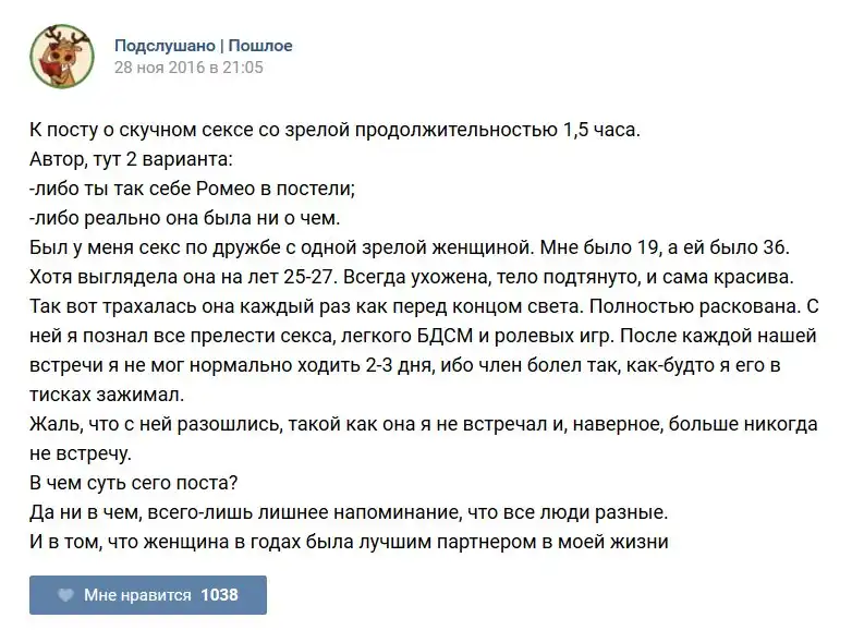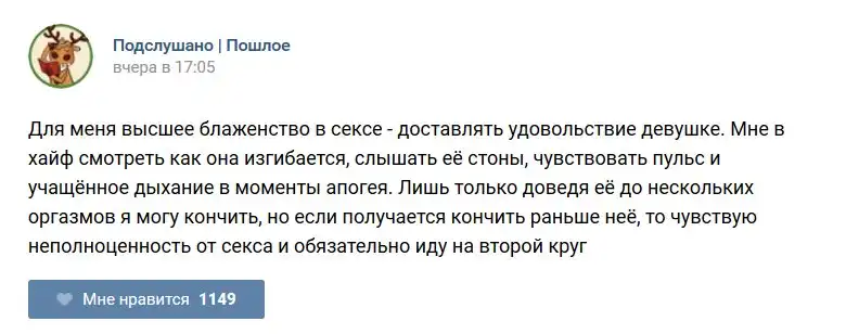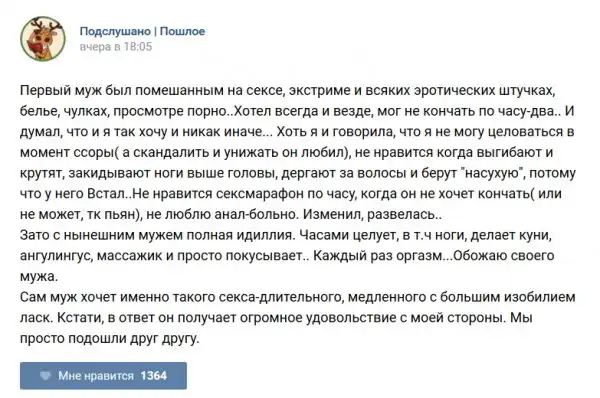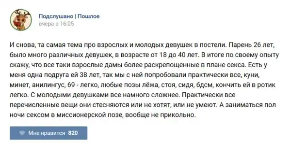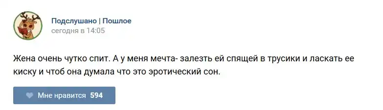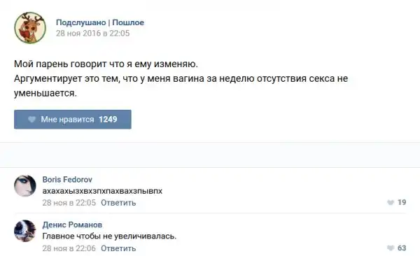 У каждого человека есть своя любимая группа или любимое сообщество в какой-либо социальной сети. Иногда это группа не совсем приличная, поэтому нет возможности в открытом режиме подписаться на неё и прочитывать свежие посты. Мы предлагаем вам очередную порцию из серии интересных постов в группе «Подслушано пошлое». Сегодняшняя запись: Подслушано пошлое предлагает посмотреть несколько интересных и запоминающихся постов, вместе с комментариями из данной группы в социальной сети ВКонтакте.