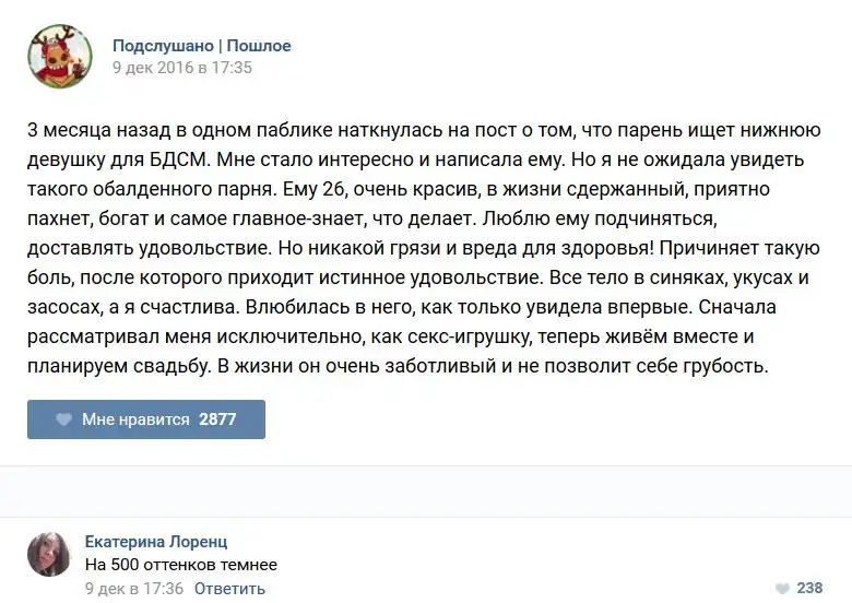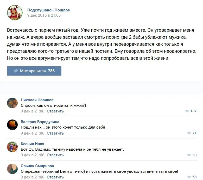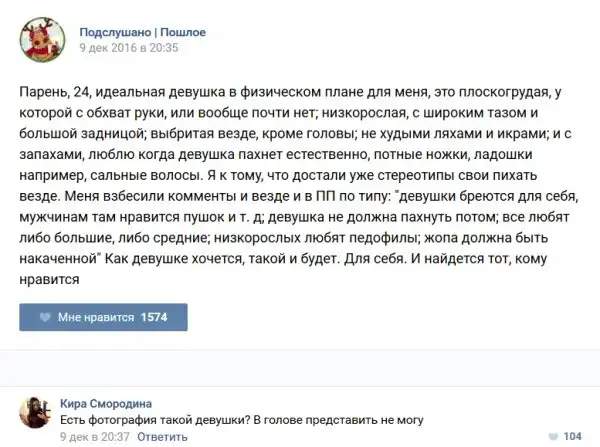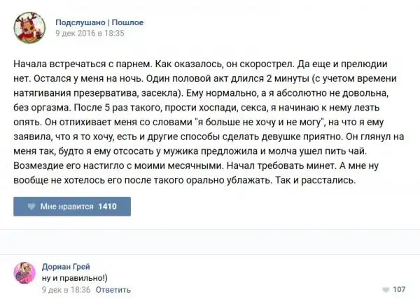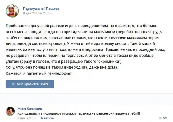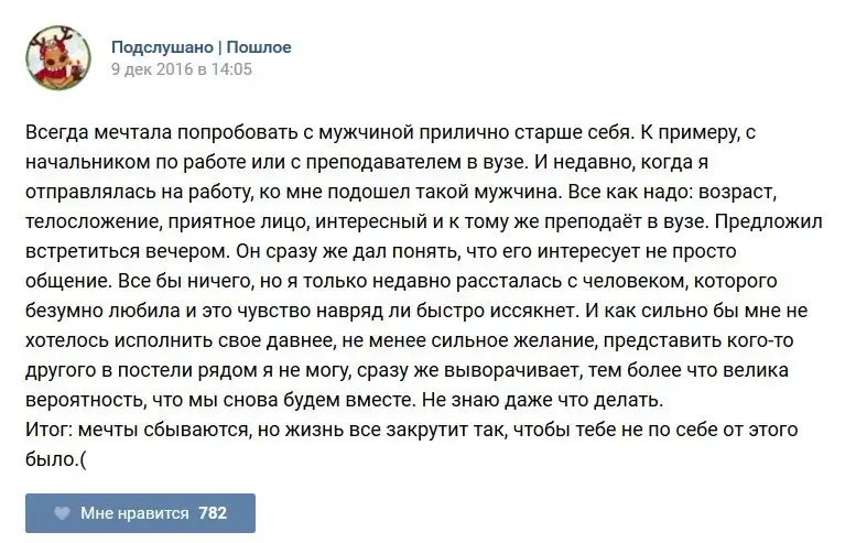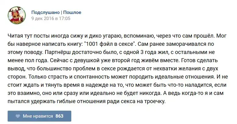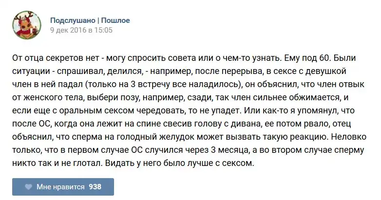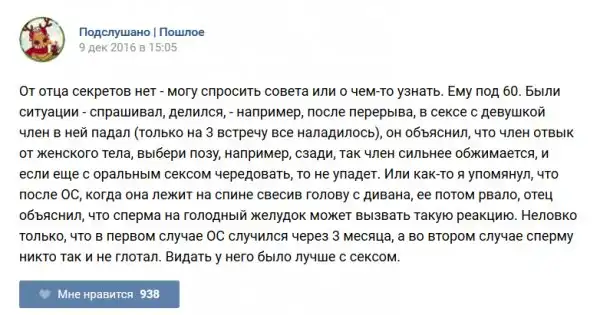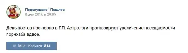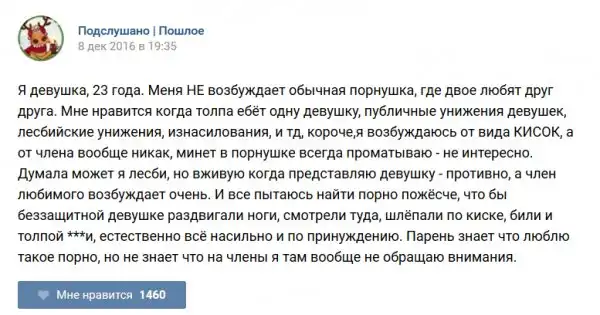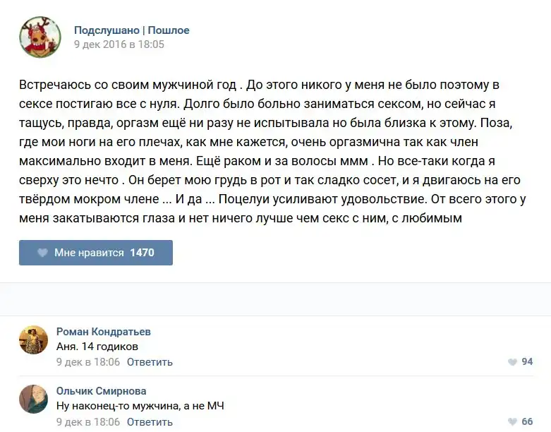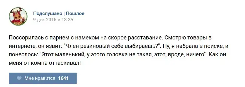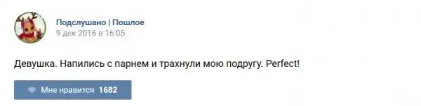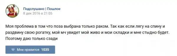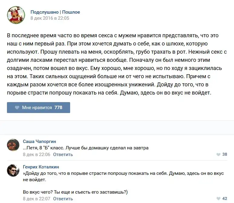 У каждого человека есть своя любимая группа или любимое сообщество в какой-либо социальной сети. Иногда это группа не совсем приличная, поэтому нет возможности в открытом режиме подписаться на неё и прочитывать свежие посты. Мы предлагаем вам очередную порцию из серии интересных постов в группе «Подслушано пошлое». Сегодняшняя запись: Подслушано пошлое предлагает посмотреть несколько интересных и запоминающихся постов, вместе с комментариями из данной группы в социальной сети ВКонтакте.
