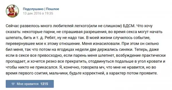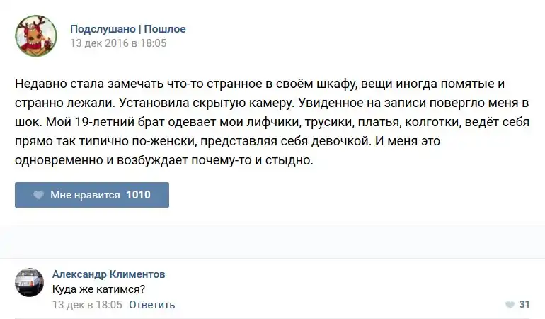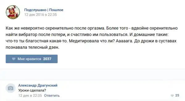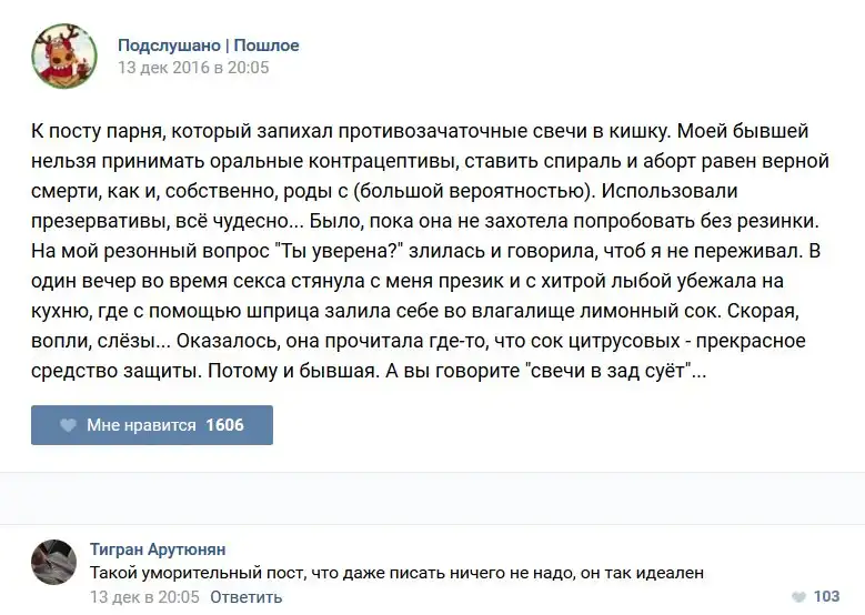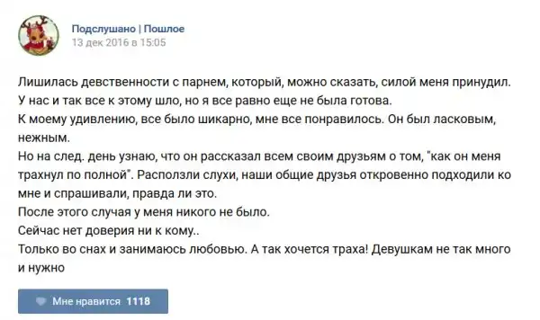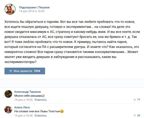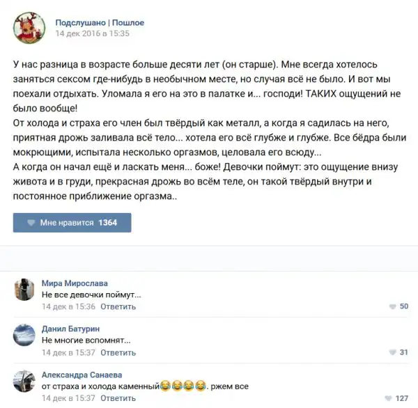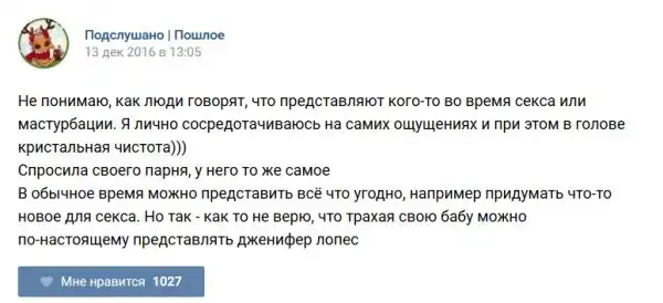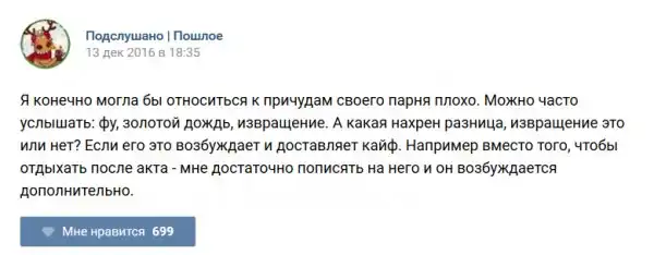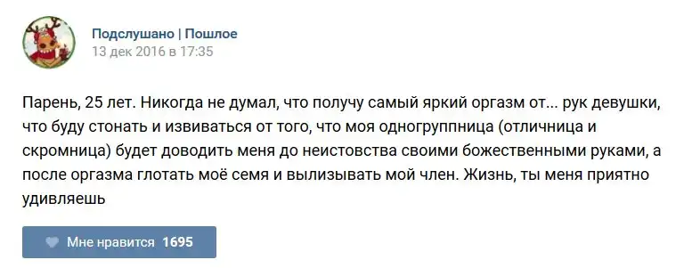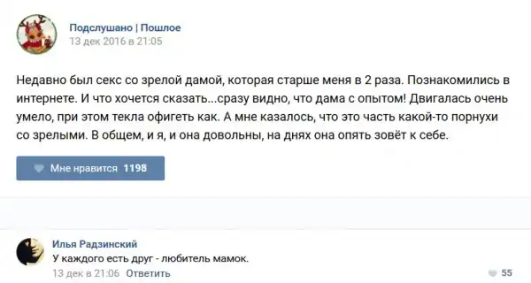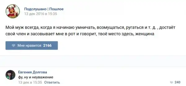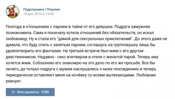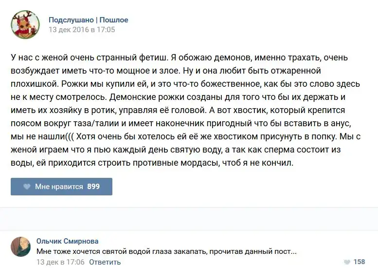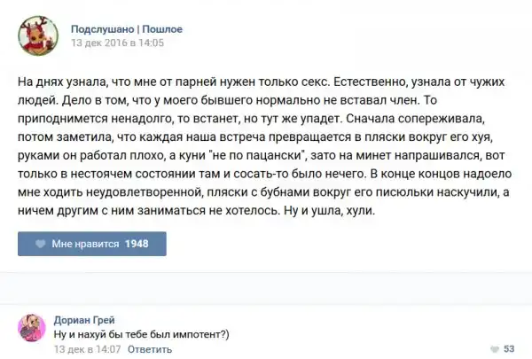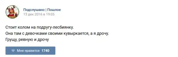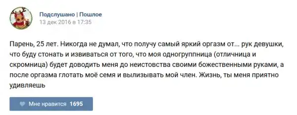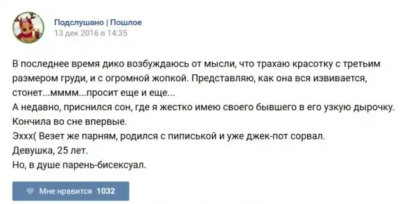 У каждого человека есть своя любимая группа или любимое сообщество в какой-либо социальной сети. Иногда это группа не совсем приличная, поэтому нет возможности в открытом режиме подписаться на неё и прочитывать свежие посты. Мы предлагаем вам очередную порцию из серии интересных постов в группе «Подслушано пошлое». Сегодняшняя запись: Подслушано пошлое предлагает посмотреть несколько интересных и запоминающихся постов, вместе с комментариями из данной группы в социальной сети ВКонтакте.