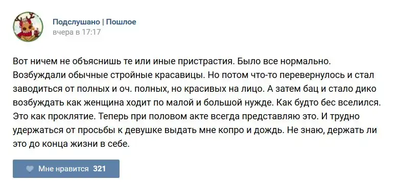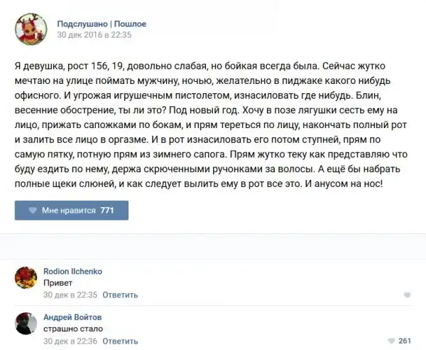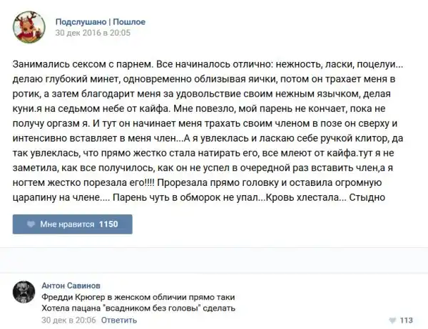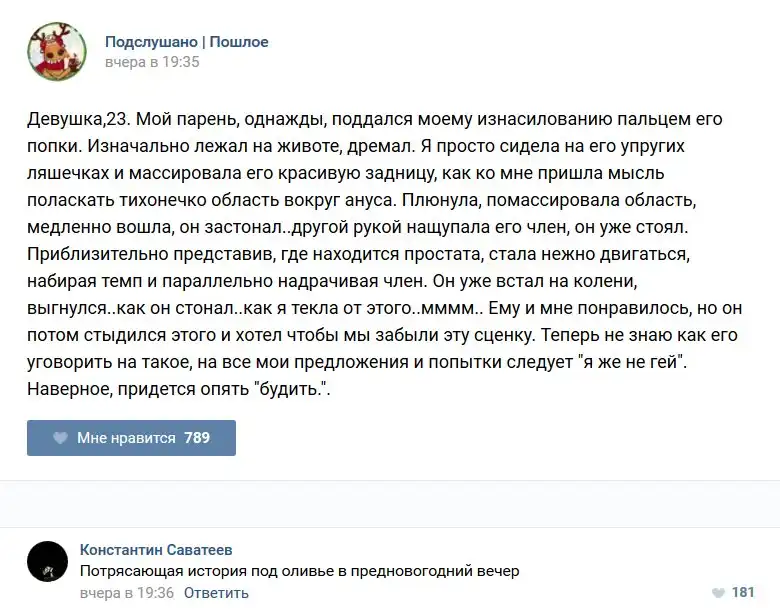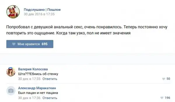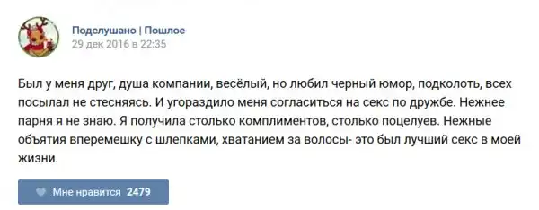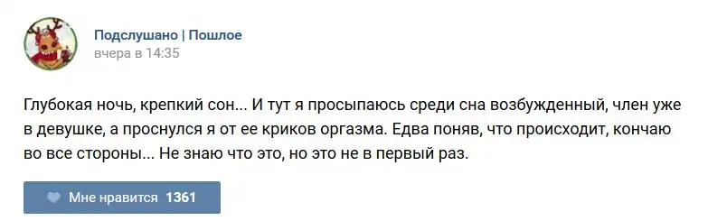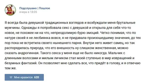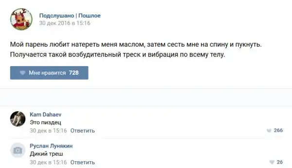 У каждого человека есть своя любимая группа или любимое сообщество в какой-либо социальной сети. Иногда это группа не совсем приличная, поэтому нет возможности в открытом режиме подписаться на неё и прочитывать свежие посты. Мы предлагаем вам очередную порцию из серии интересных постов в группе «Подслушано пошлое». Сегодняшняя запись: Подслушано пошлое предлагает посмотреть несколько интересных и запоминающихся постов, вместе с комментариями из данной группы в социальной сети ВКонтакте.