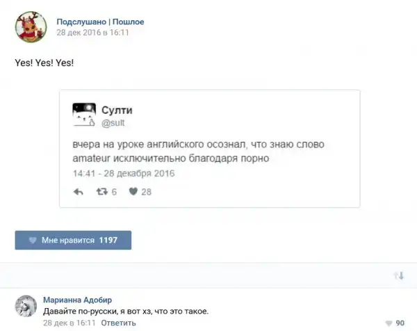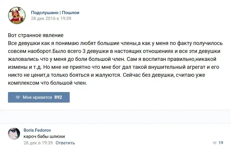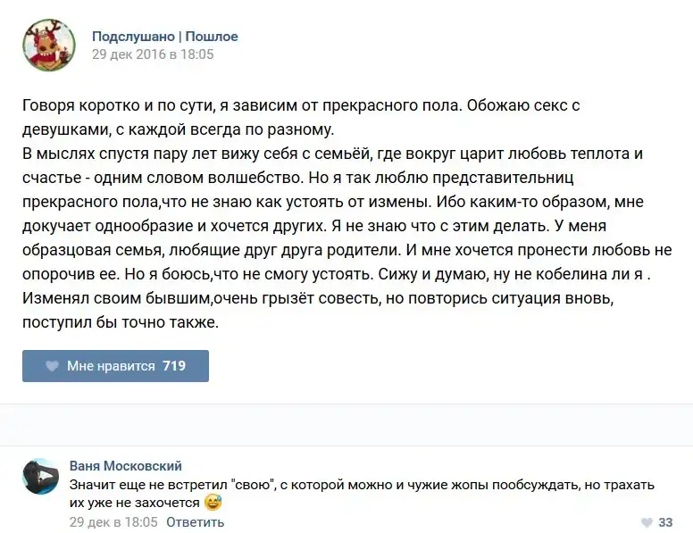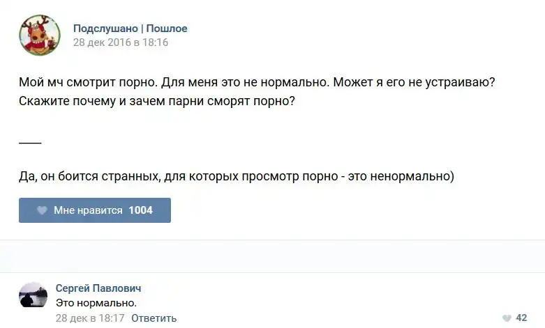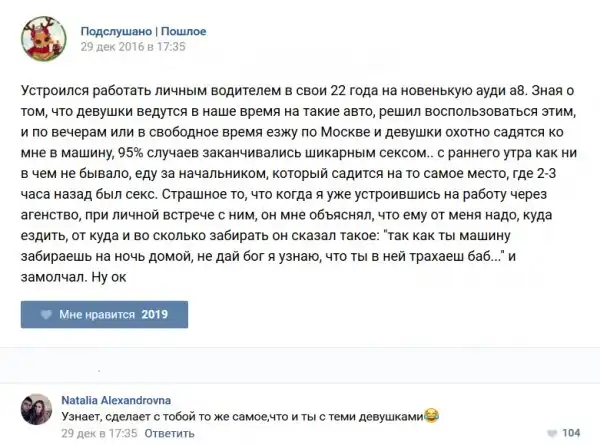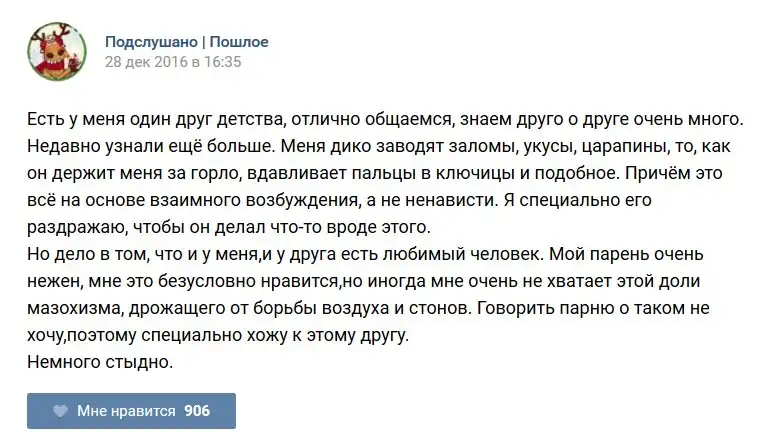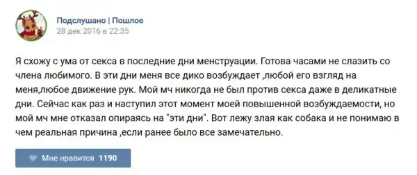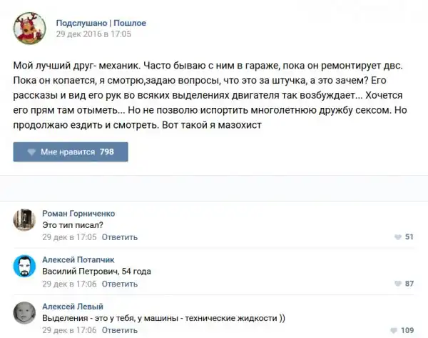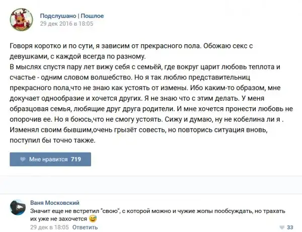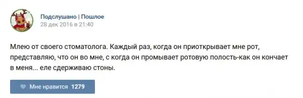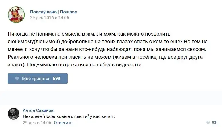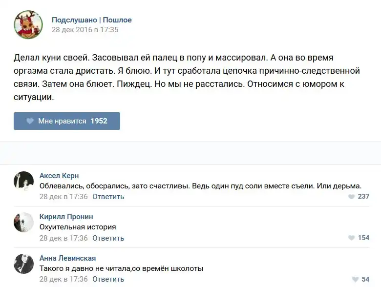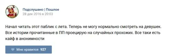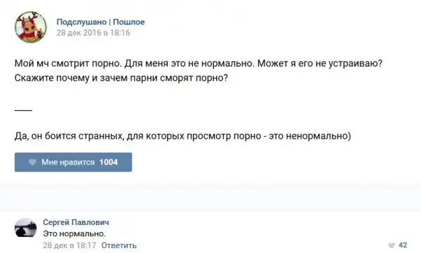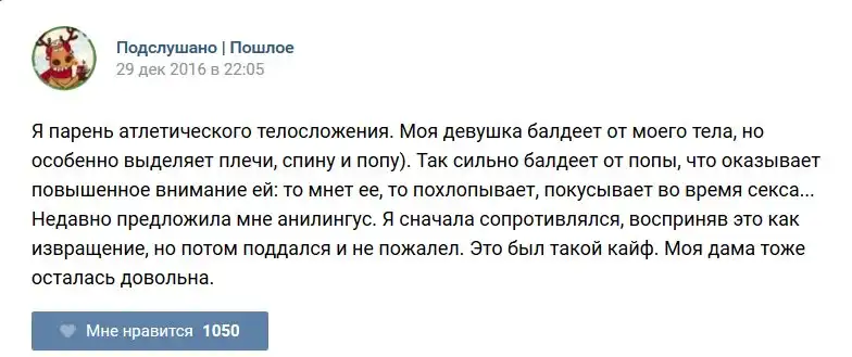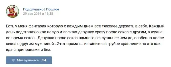 У каждого человека есть своя любимая группа или любимое сообщество в какой-либо социальной сети. Иногда это группа не совсем приличная, поэтому нет возможности в открытом режиме подписаться на неё и прочитывать свежие посты. Мы предлагаем вам очередную порцию из серии интересных постов в группе «Подслушано пошлое». Сегодняшняя запись: Подслушано пошлое предлагает посмотреть несколько интересных и запоминающихся постов, вместе с комментариями из данной группы в социальной сети ВКонтакте.
