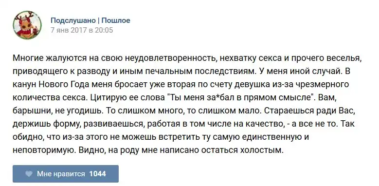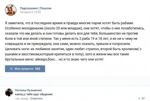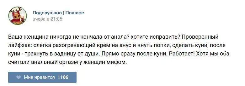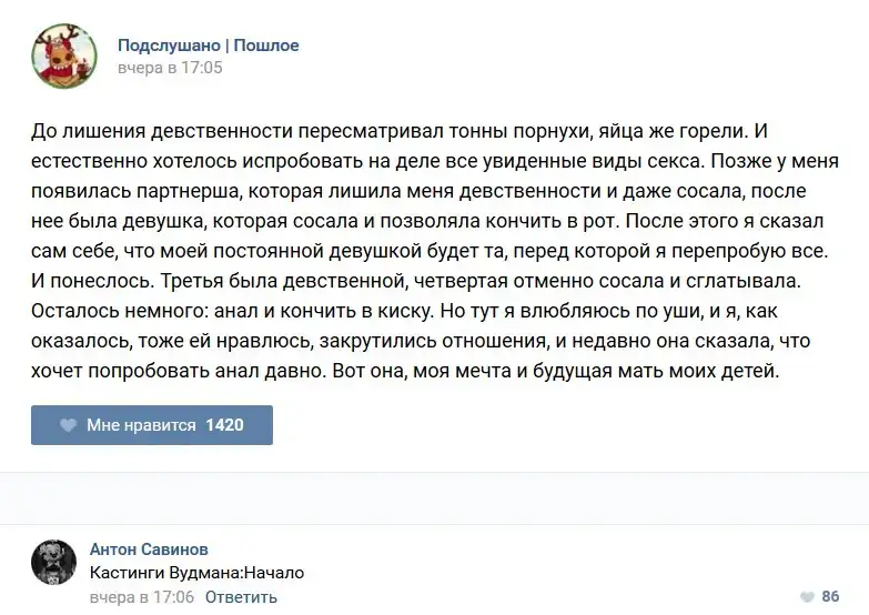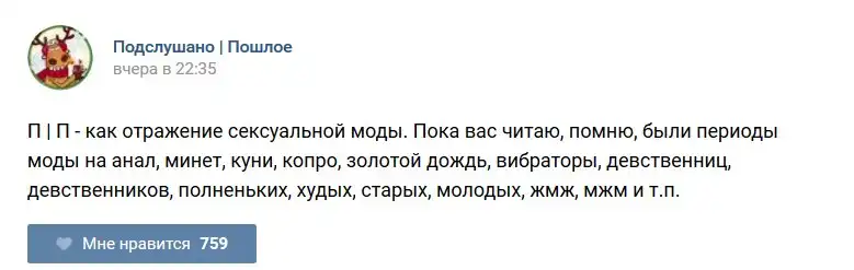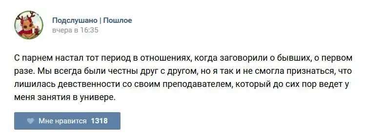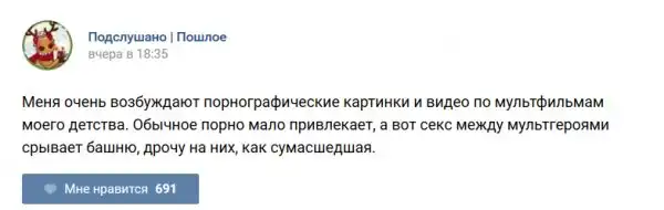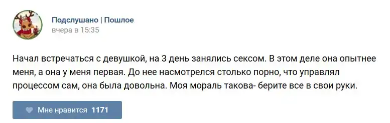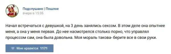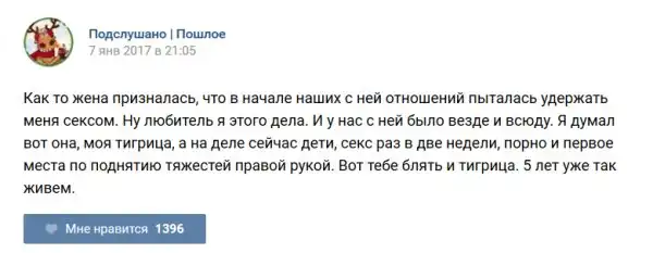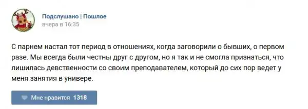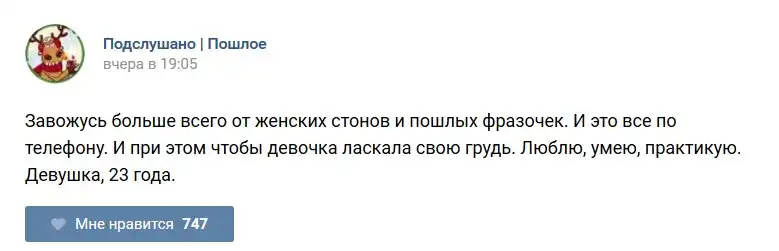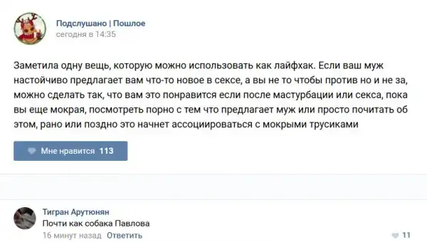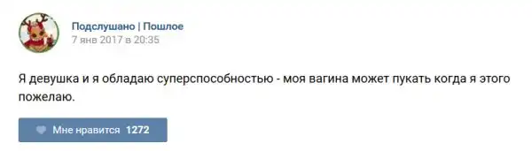 У каждого человека есть своя любимая группа или любимое сообщество в какой-либо социальной сети. Иногда это группа не совсем приличная, поэтому нет возможности в открытом режиме подписаться на неё и прочитывать свежие посты. Мы предлагаем вам очередную порцию из серии интересных постов в группе «Подслушано пошлое». Сегодняшняя запись: Подслушано пошлое (25 фото) предлагает посмотреть несколько интересных и запоминающихся постов, вместе с комментариями из данной группы в социальной сети ВКонтакте.