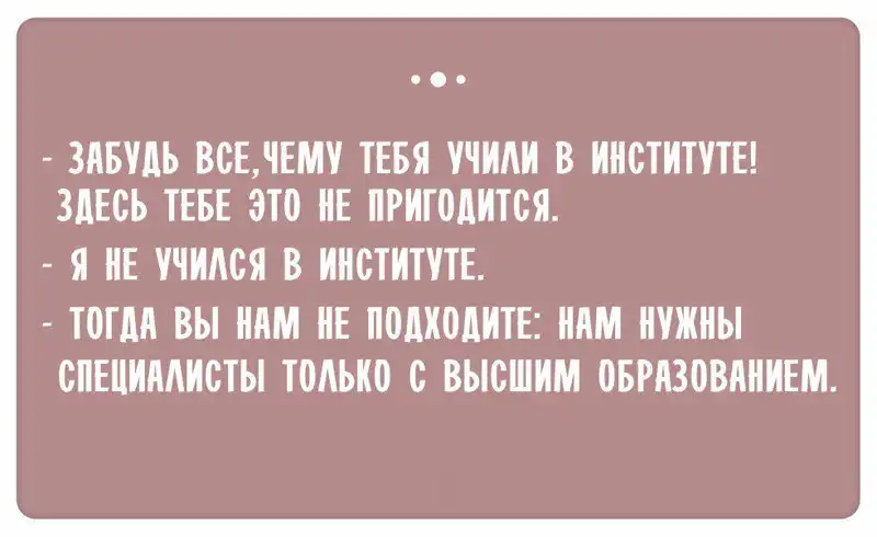 У меня было собеседование еще короче. Закончил универ, диплом на руках, весь в поисках своей первой работы и т. д. Пригласили на собеседование. И вот я стою перед дверью HR-отдела, меня трясет, как перед первым экзаменом. Стучу в дверь, открываю ее и выдаю: «Алло. Здравствуйте...» О*****ю со своего «алло», краснею и молча удаляюсь. ©katuni