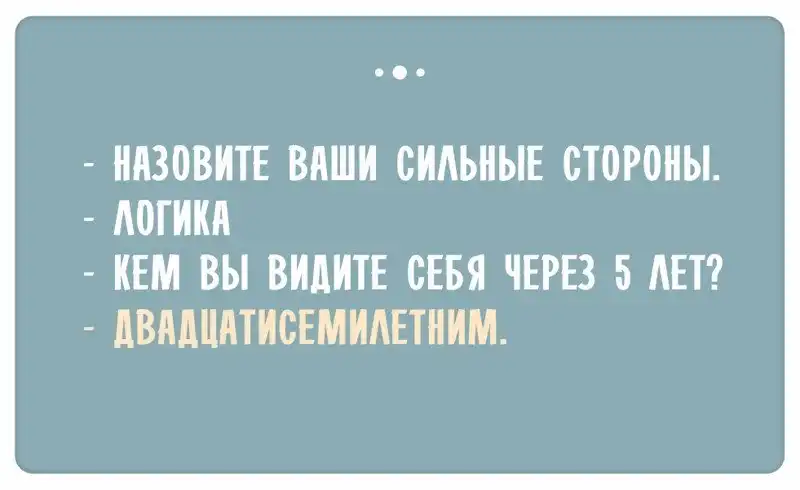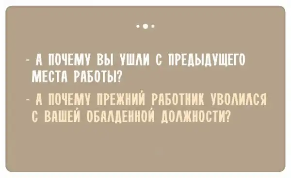 Собеседование длилось секунд 10. Открывается дверь, в переговорную заходит соискатель, бросает визитку на стол со словами: «Жду от вас звонка в ближайшее время». И уходит в закат легкой джазовой походкой. А на визитке написаны ФИО, контактный телефон и, внимание, желаемая должность — топ-менеджер. У меня только один вопрос: а че, так можно было? ©BlackIllusion