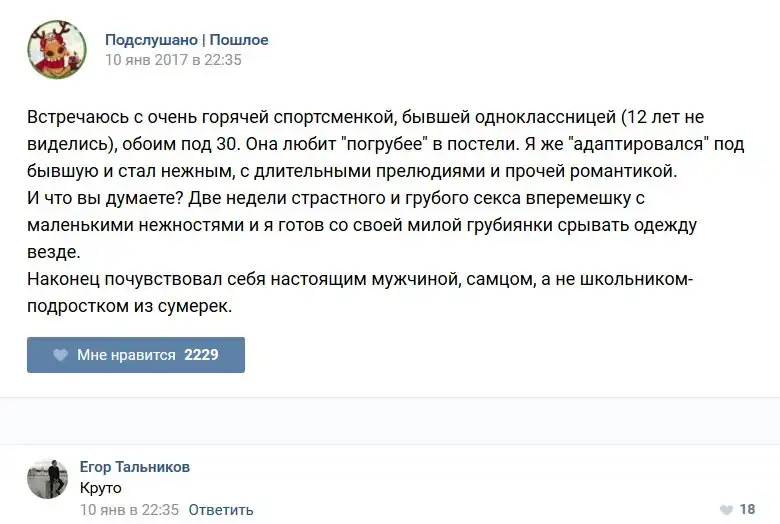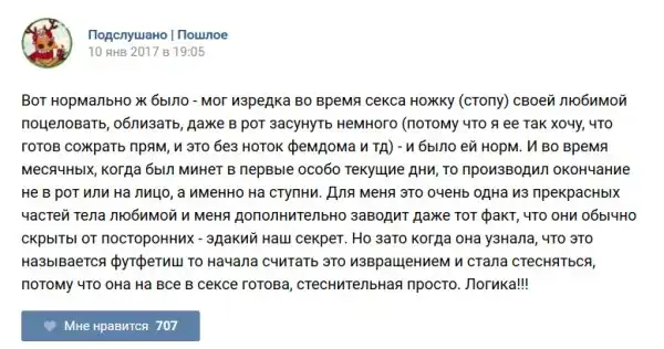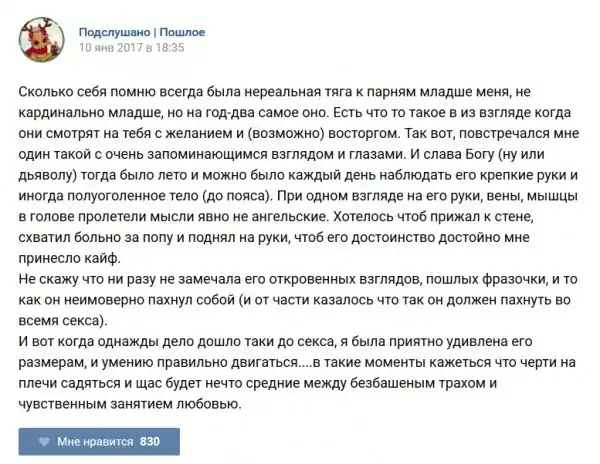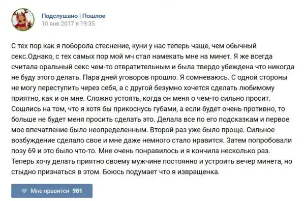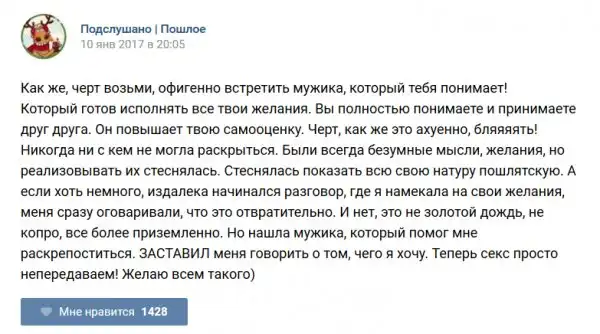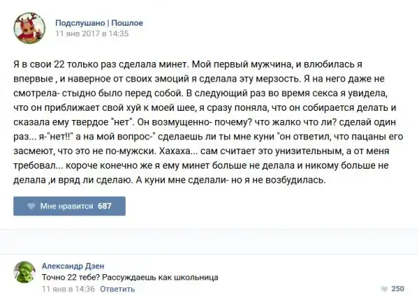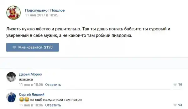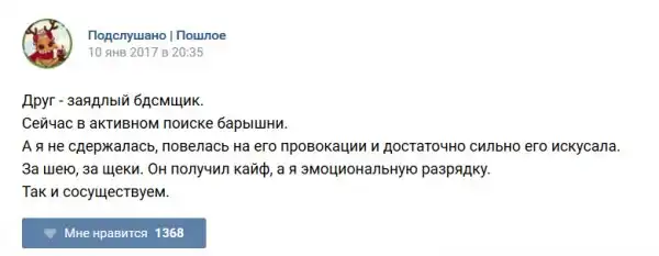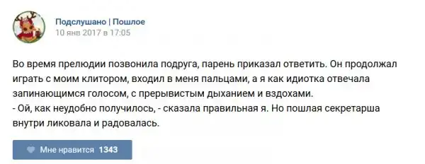 У каждого человека есть своя любимая группа или любимое сообщество в какой-либо социальной сети. Иногда это группа не совсем приличная, поэтому нет возможности в открытом режиме подписаться на неё и прочитывать свежие посты. Мы предлагаем вам очередную порцию из серии интересных постов в группе «Подслушано пошлое». Сегодняшняя запись: Подслушано пошлое (25 фото) предлагает посмотреть несколько интересных и запоминающихся постов, вместе с комментариями из данной группы в социальной сети ВКонтакте.