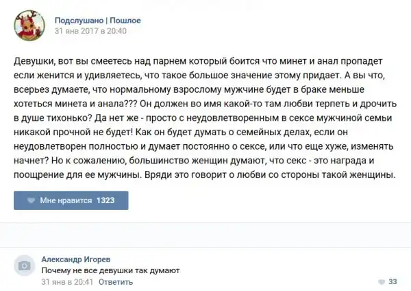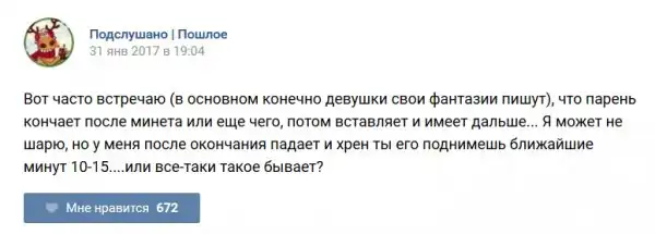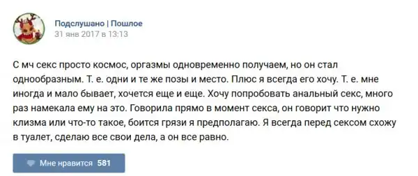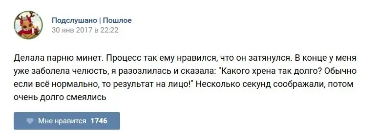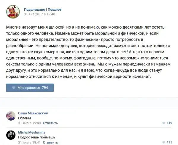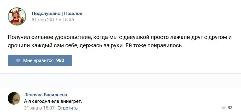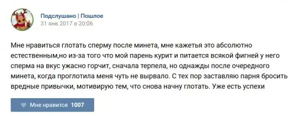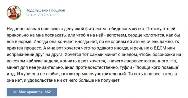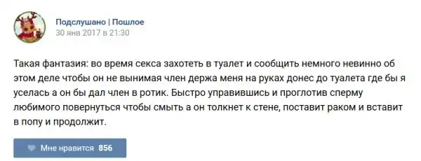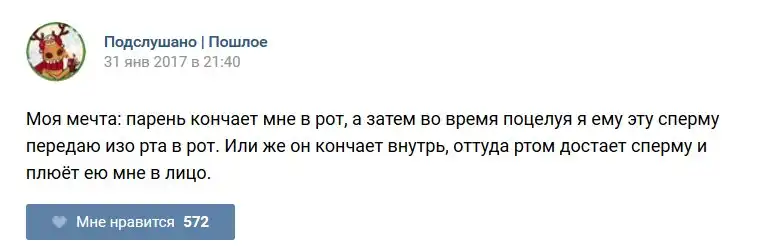 У каждого человека есть своя любимая группа или любимое сообщество в какой-либо социальной сети. Иногда это группа не совсем приличная, поэтому нет возможности в открытом режиме подписаться на неё и прочитывать свежие посты. Мы предлагаем вам очередную порцию из серии интересных постов в группе «Подслушано пошлое». Сегодняшняя запись: Подслушано пошлое (25 фото) предлагает посмотреть несколько интересных и запоминающихся постов, вместе с комментариями из данной группы в социальной сети ВКонтакте.