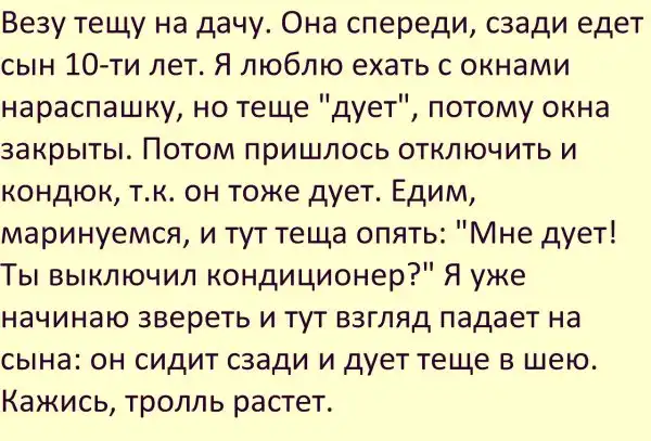 Везу тёщу на дачу. Она спереди, сзади едет сын 10-ти лет...