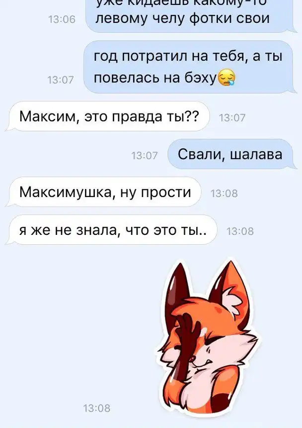 Саня (одноклассник) рассказал, что лучше проверить будущую супругу .Сделал я фейковый аккаунт по его наставлениям, и понеслась .Рыдаю сейчас, слов подобрать не могу, лишился семьи, когда мне не было и 12, карьеру построил с нуля сам, думал, что она самый дорогой в мире человек. Чтоб тебя в аду черти жарили, шкура.