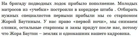 Мы обошли строй, вглядываясь в молодые, почти юные лица, слегка встревоженные переменой в жизни: учебный отряд – это одно, а экипаж подводной лодки – совсем другое… Однако, как не вглядывайся, но кто из них кто – разгильдяй, отличник, забияка, маменькин сынок или матрос Кошка – с первого взгляда не угадаешь.