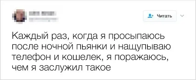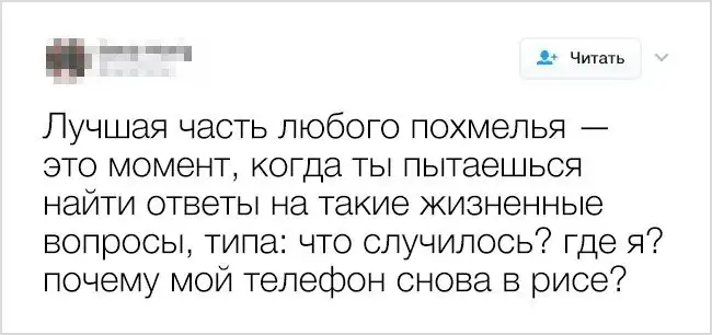 Все мы хорошо знаем, какими последствиями порой чреваты веселые вечеринки. Особенно "прекрасно" осознавать, какой выдалась вечеринка наутро после нее, когда вы испытываете жуткое похмелье и в очередной раз обещаете себе, что больше не будете так много пить. Если все это про вас, то вы обязательно оцените эти забавные твиты, которые оставили люди, находящиеся на одной волне вместе с вами.